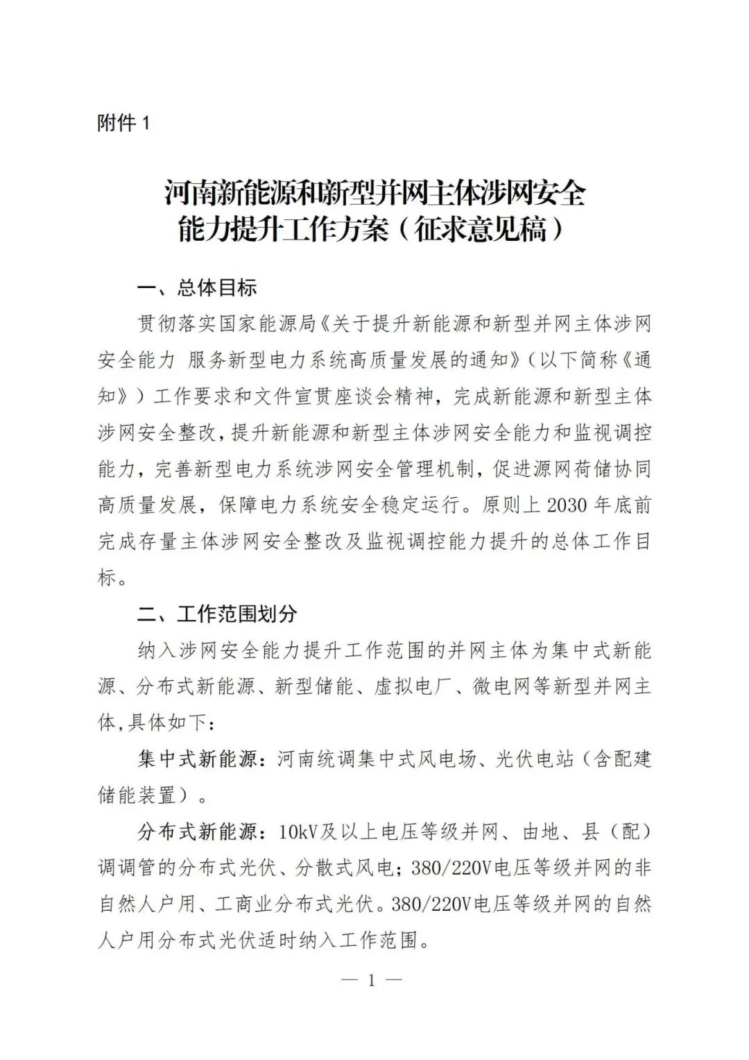 5月19日,国家能源局河南监管办公室、河南省发展和改革委员会印发关于公开征求《河南新能源和新型并网主体涉网安全能力提升工作方案(征求意见稿)》意见的通知。方案指出: