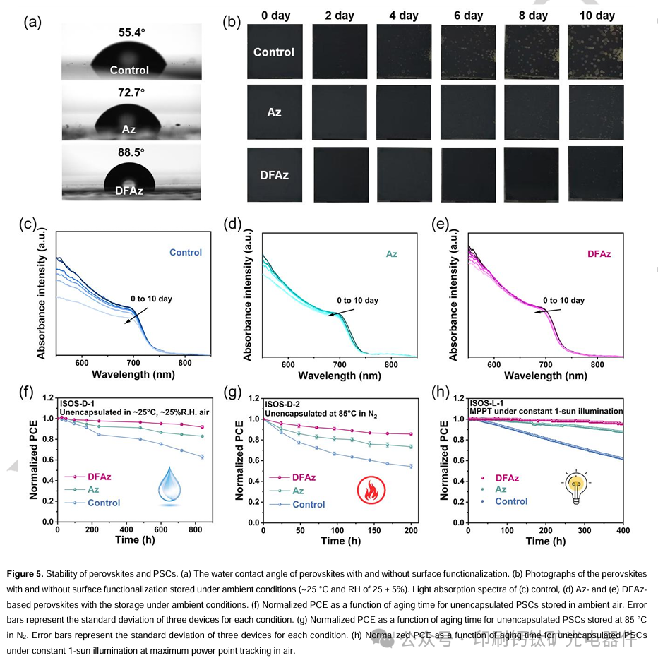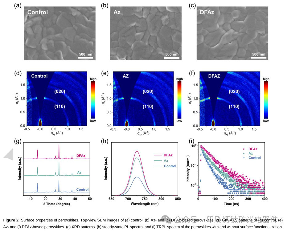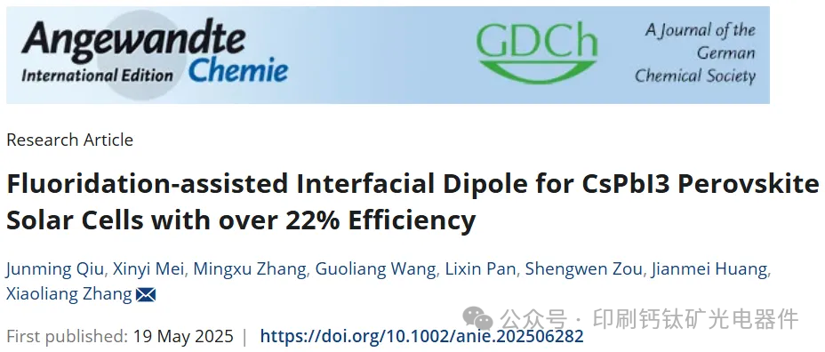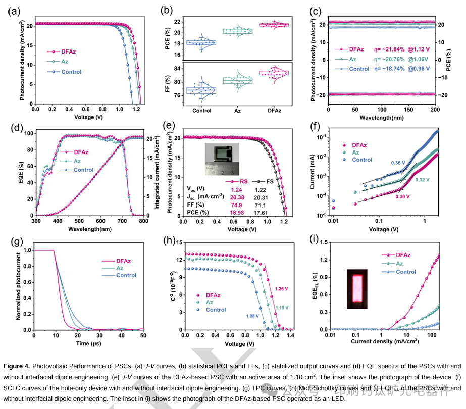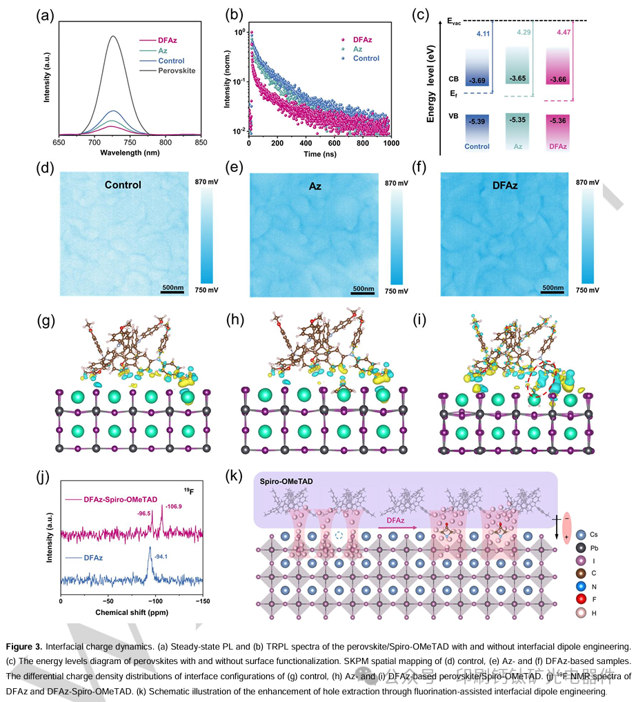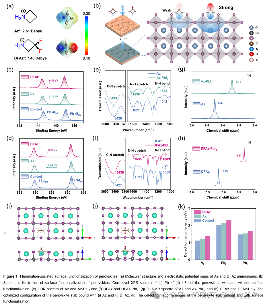 无机CsPbI3钙钛矿因其优异的热稳定性和光电特性,在光伏应用领域备受关注。然而,由于界面非辐射复合和载流子传输不良,CsPbI3钙钛矿太阳能电池的能量损失严重,严重影响其光伏性能和工作稳定性。鉴于此,北航张晓亮团队在期刊《Angewandte Chemie International Edition》发文“Fluoridation-assisted Interfacial Dipole for CsPbI3 Perovskite Solar Cells with over 22% Efficiency”介绍了一种用于CsPbI3钙钛矿太阳能电池的界面偶极子调控方法,利用氮杂环丁烷氯化物(Az)及其氟化衍生物3,3-二氟氮杂环丁烷氯化物(DFAz)来调控钙钛矿太阳能电池的界面特性,从而降低能量损失。系统的理论计算和实验研究表明,氟化辅助的铵分子能够与钙钛矿形成更强的相互作用,从而调整钙钛矿表层的偶极子排列,同时改善钙钛矿层和空穴传输层的钝化效果和能级排列,从而抑制界面复合。同时,铵分子与空穴传输层之间的配位键合提供了额外的载流子传输通道,促进了异质结界面处的电荷传输。因此,CsPbI3钙钛矿太阳能电池的效率高达22.05%。该研究为高性能太阳能电池的界面工程设计提供了重要的原则,以最大限度地降低能量损失。