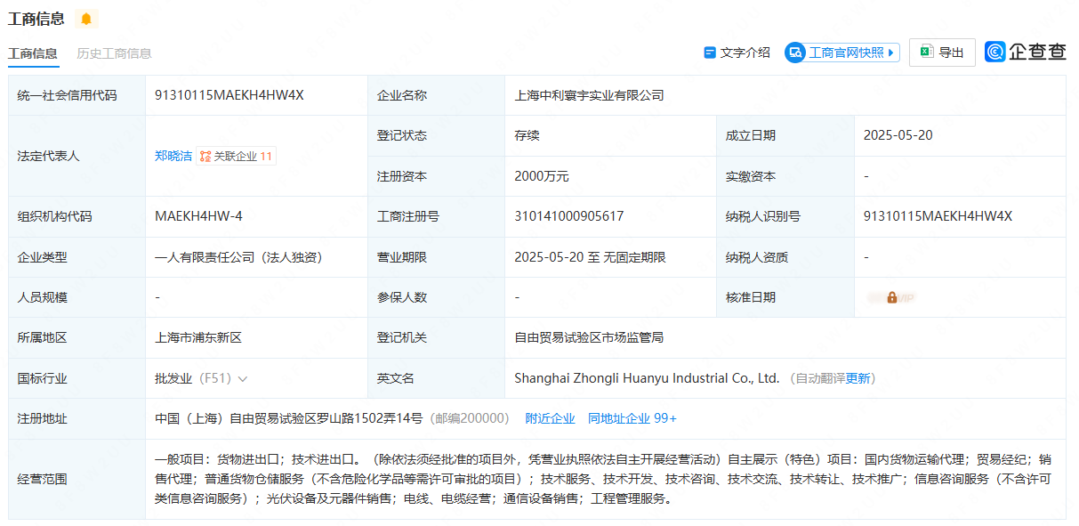 索比光伏网获悉,,近日,上海中利寰宇实业有限公司成立,注册资本2000万元,经营范围包含:光伏设备及元器件销售;电线、电缆经营;通信设备销售;工程管理服务等。企查查股权穿透显示,该公司由*ST中利全资持股。