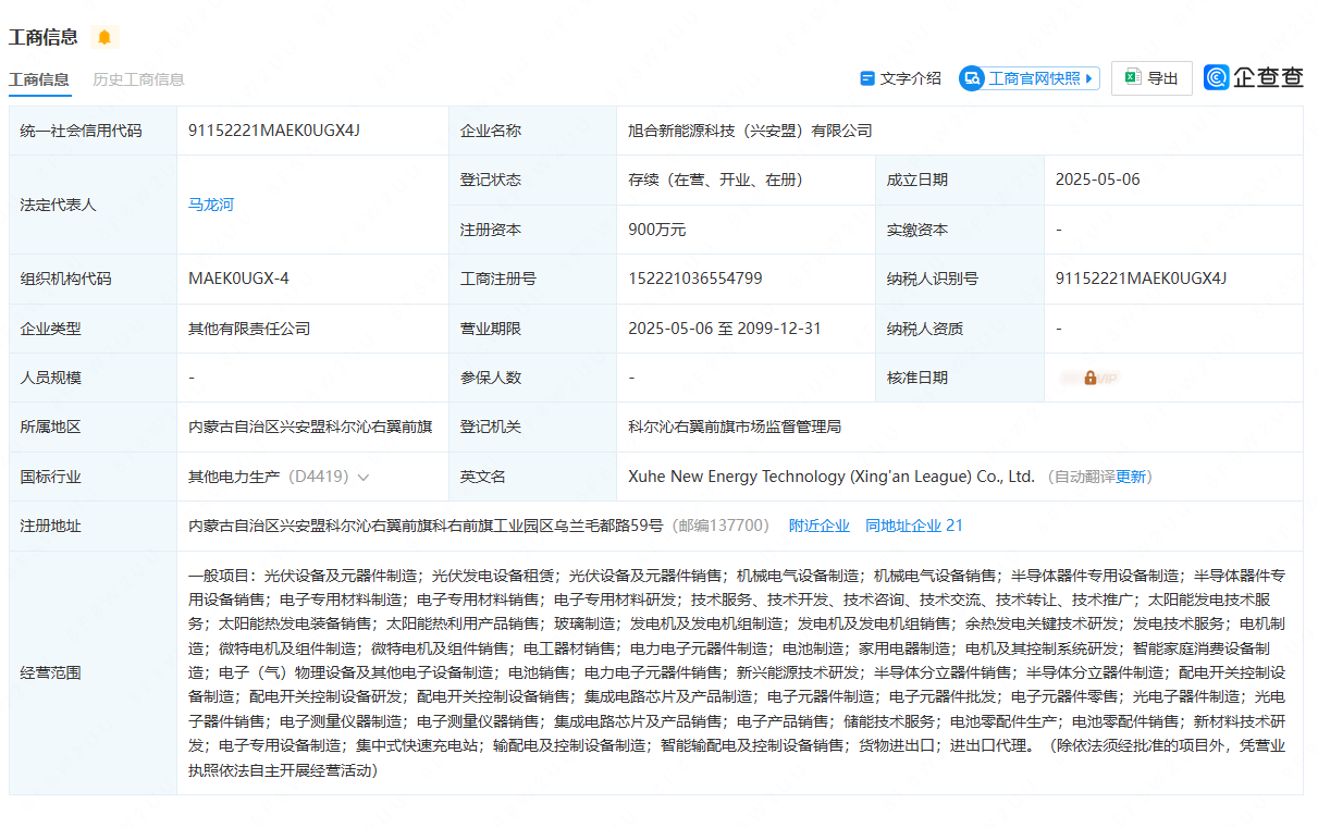 索比光伏网获悉,近日,旭合新能源科技(兴安盟)有限公司成立,法定代表人为马龙河,注册资本为900万元,经营范围包含:光伏设备及元器件制造;半导体器件专用设备制造;半导体器件专用设备销售;电子专用材料制造;电池制造;家用电器制造等。企查查股权穿透显示,该公司由安徽旭合新能源科技有限公司、蓝丰生化(002513)旗下江苏蓝丰进出口有限公司共同持股。