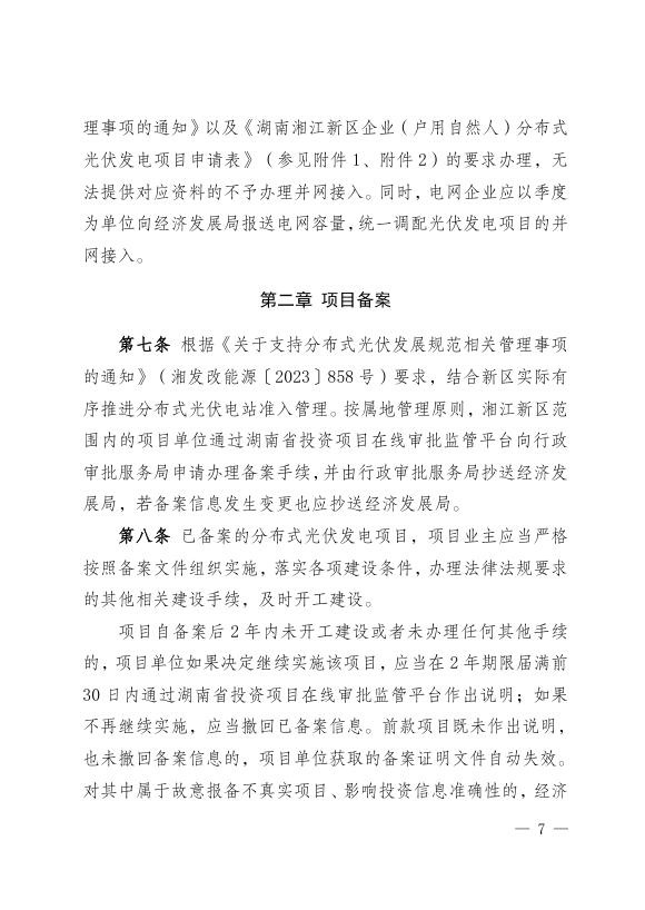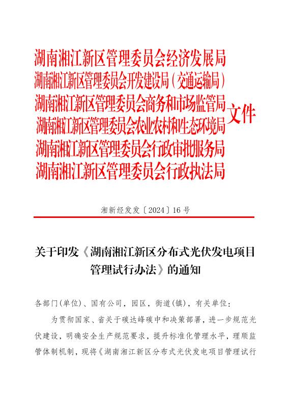 近期受政策调整影响,辖区内分布式光伏项目申报量激增。为确保各申报单位项目按期完成审核流程并享受对应电价政策,根据《湖南湘江新区分布式光伏发电项目管理试行办法》(湘新经发发〔2024〕16号,自2024年12月4日起施行)、国家能源局印发的《分布式光伏发电开发建设管理办法》(国能发新能规〔2025〕7号,自2025年1月17日起施行)文件精神,结合国家能源局电价政策窗口期衔接要求,现就有关事项通知如下: