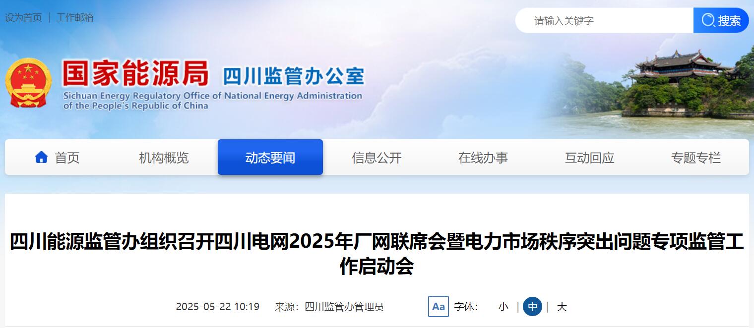 5月16日,四川能源监管办组织召开四川电网2025年厂网联席会暨电力市场秩序突出问题专项监管工作启动会。国网西南分部、国网四川省电力公司、四川能源发展集团有限责任公司、四川电力交易中心、25家发售电企业等单位负责人参加会议。四川能源监管办负责同志出席会议并讲话。