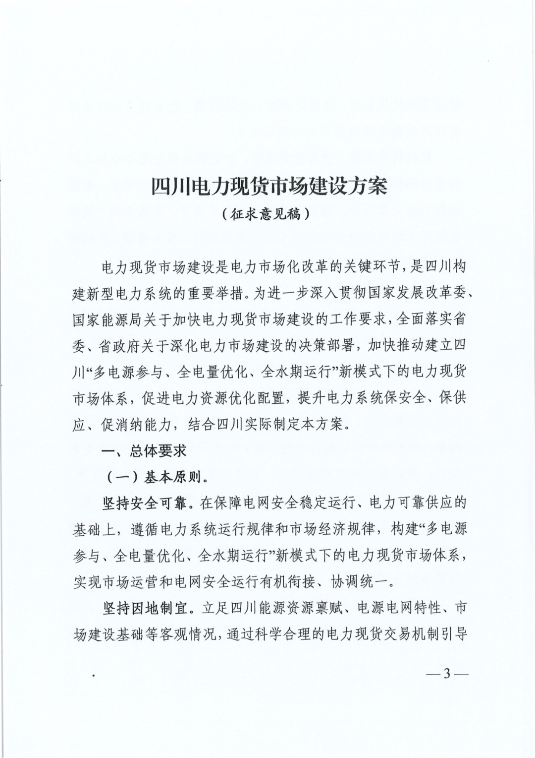 近日,四川省发改委、四川省能源局、四川省能监联下发《四川电力现货市场建设方案(征求意见稿)》的函。主要摘要如下: