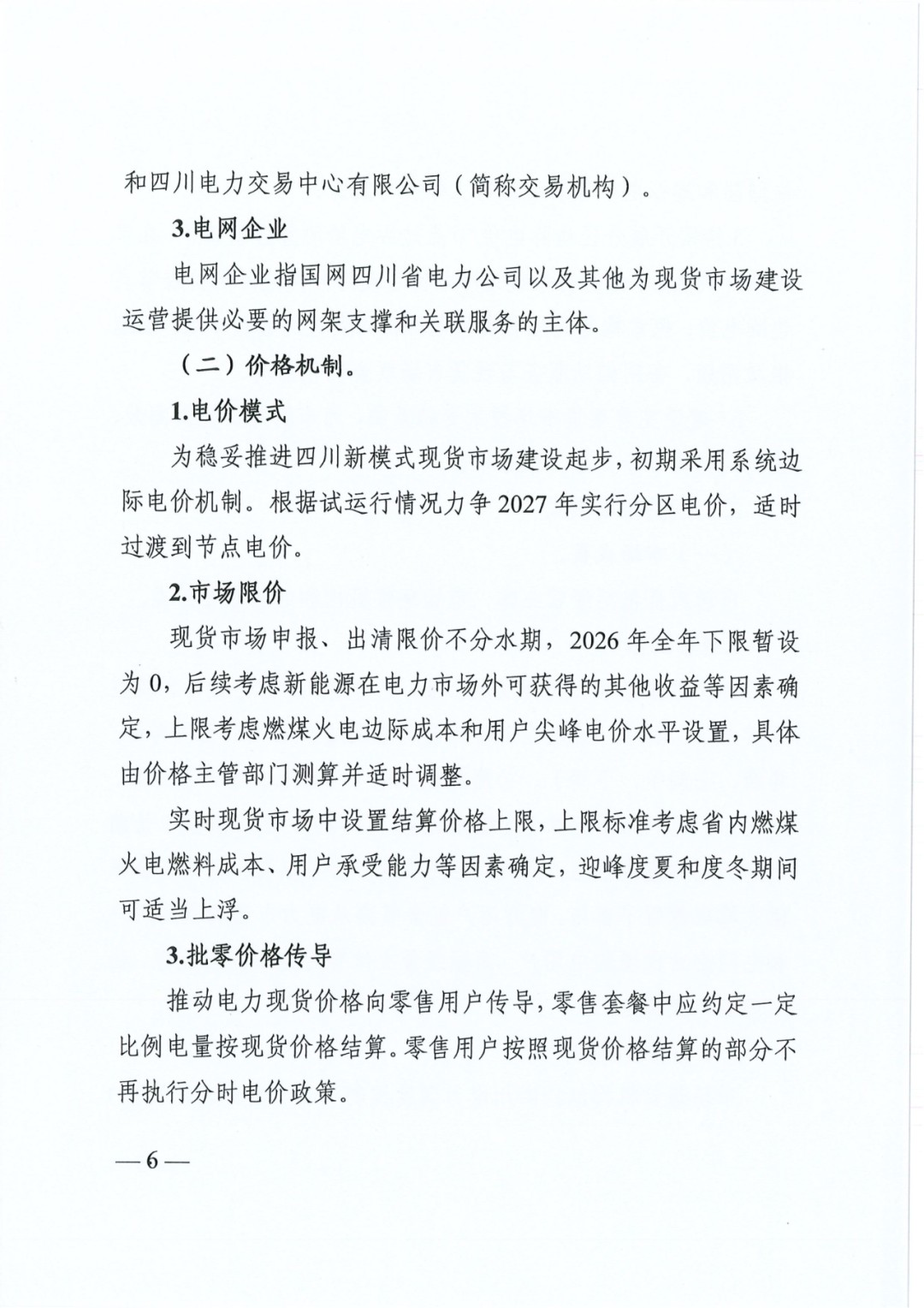 现货市场申报、出清限价不分水期,2026年全年下限暂设为 0,后续考虑新能源在电力市场外可获得的其他收益等因素确定,上限考虑燃煤火电边际成本和用户尖峰电价水平设置,具体由价格主管部门测算并适时调整。