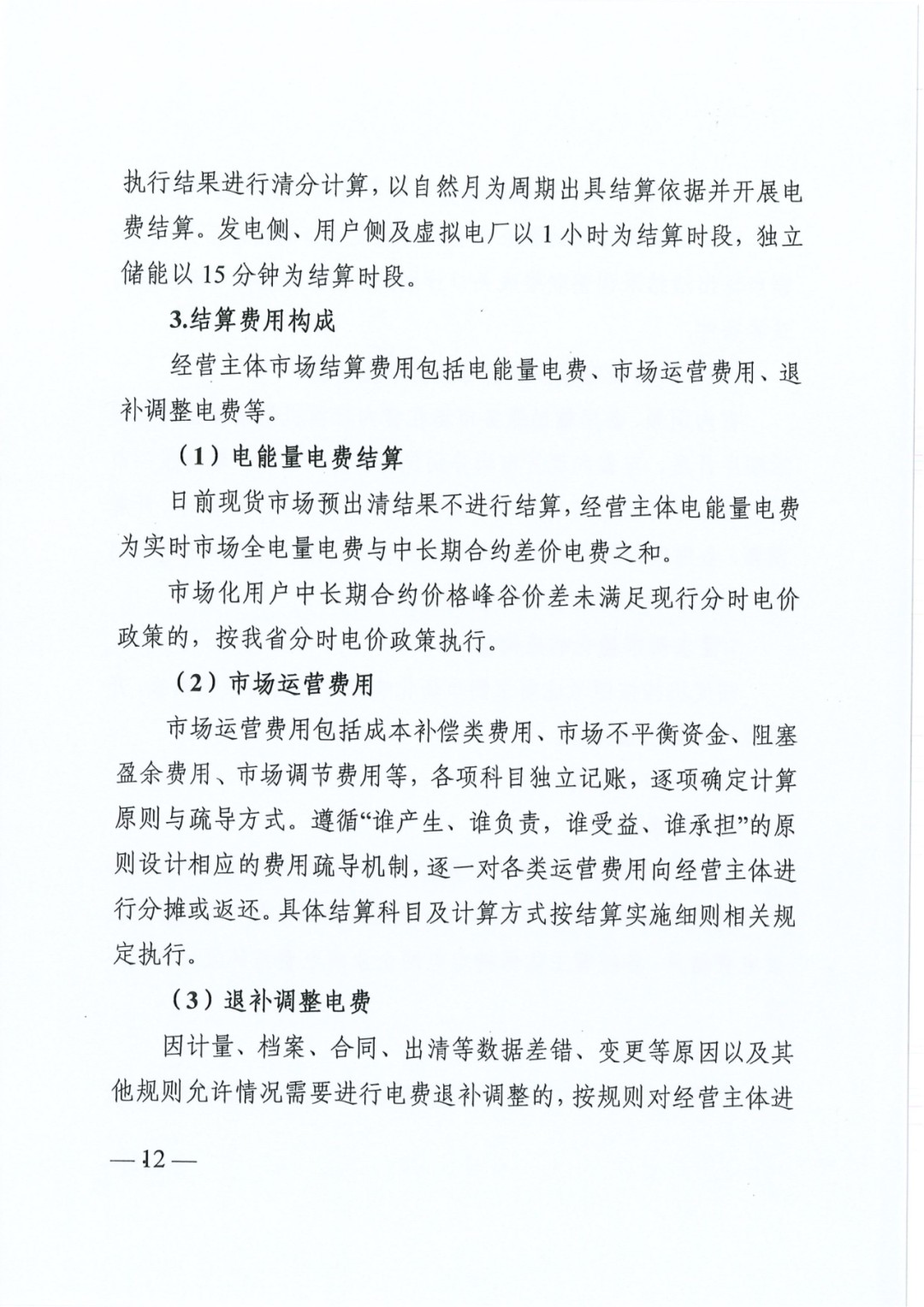 日前现货市场预出清结果不进行结算,经营主体电能量电费为实时市场全电量电费与中长期合约差价电费之和。市场化用户中长期合约价格峰谷价差未满足现行分时电价政策的,按我省分时电价政策执行。