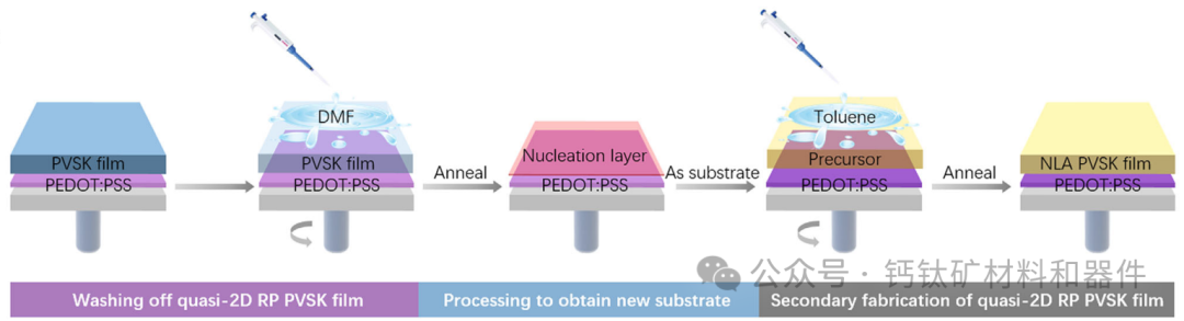 成核层的形成过程包括洗掉制备的钙钛矿薄膜并将残留物退火到衬底上,从而产生用于钙钛矿薄膜制造的新衬底。这种成核层可以将随后沉积的钙钛矿薄膜从具有随机晶体取向的小 n值主导的宽相分布转变为具有垂直晶体取向的中等n值主导的窄相分布。