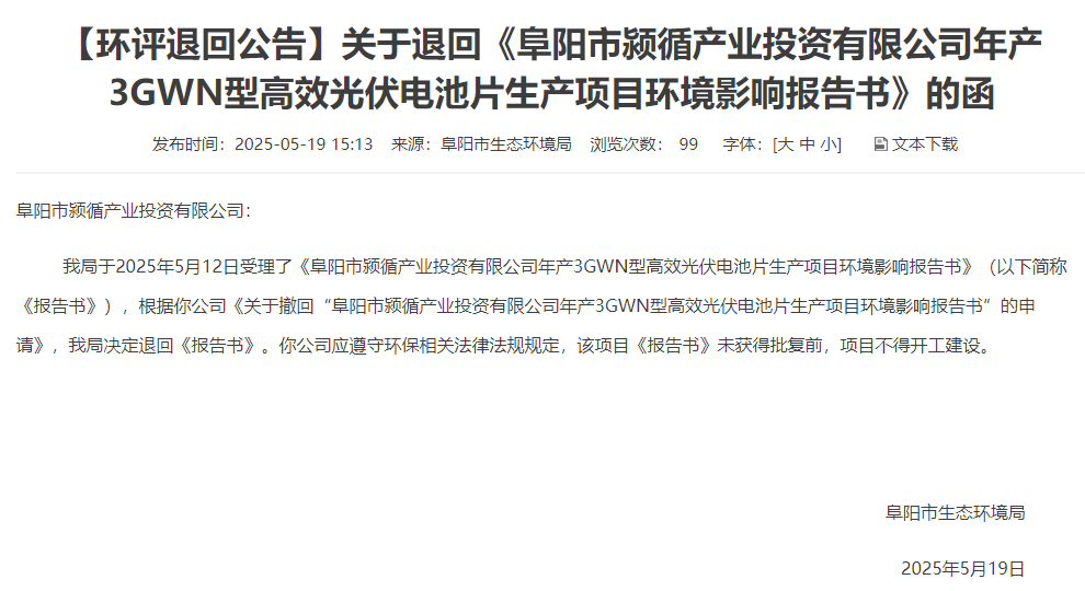 5月19日,安徽省阜阳市生态环境局发布关于退回《阜阳市颍循产业投资有限公司年产3GW N型高效光伏电池片生产项目环境影响报告书》的函。