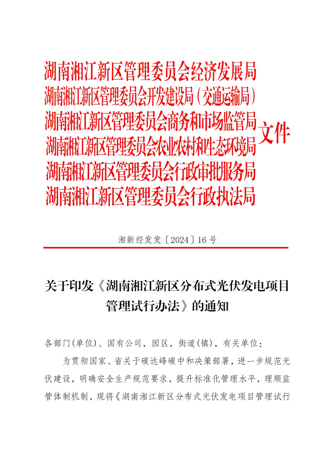 近期受政策调整影响,辖区内分布式光伏项目申报量激增。为确保各申报单位项目按期完成审核流程并享受对应电价政策,根据《湖南湘江新区分布式光伏发电项目管理试行办法》(湘新经发发〔2024〕16号,自2024年12月4日起施行)、国家能源局印发的《分布式光伏发电开发建设管理办法》(国能发新能规〔2025〕7号,自2025年1月17日起施行)文件精神,结合国家能源局电价政策窗口期衔接要求,现就有关事项通知如下: