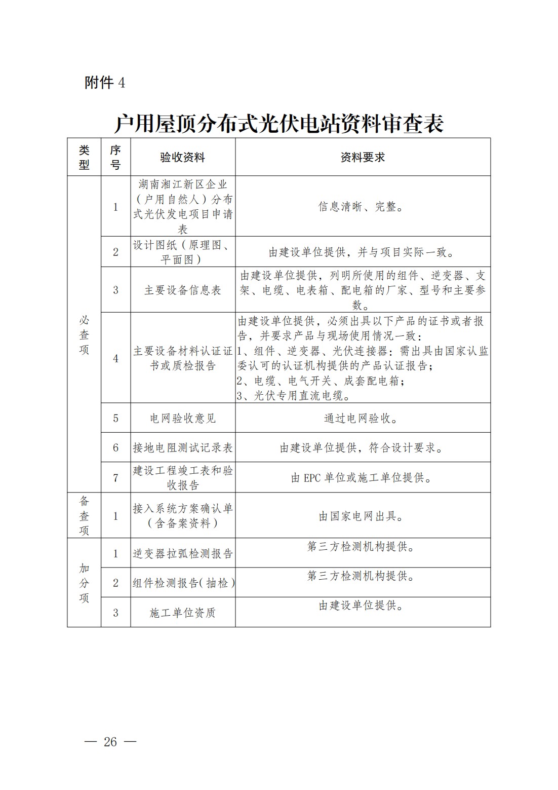1.必备材料:依据《湖南湘江新区分布式光伏发电项目管理试行办法》要求,必备材料包括但不限于项目备案文件、接入系统方案、建设单位及设计单位营业执照、相关资质证明、房屋安全鉴定报告及承载分析计算报告、光伏产品认证文件、竣工验收报告等;