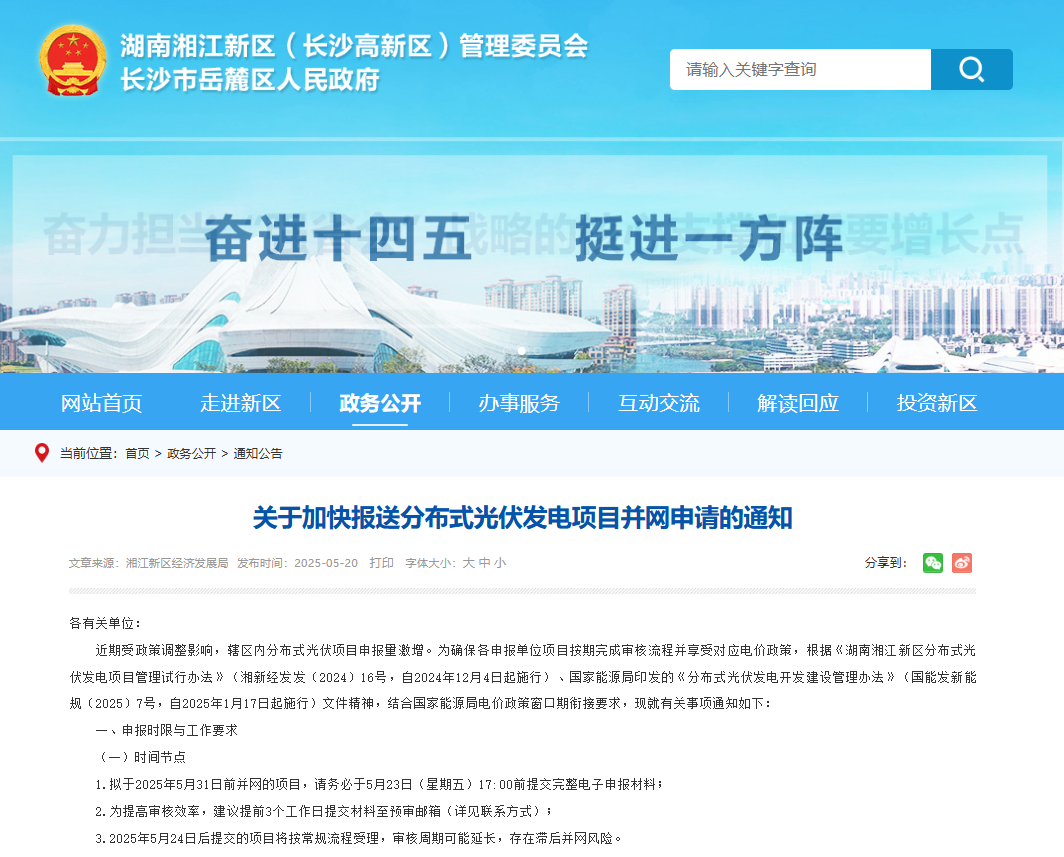 5月20日,湖南湘江新区经济发展局发布《关于加快报送分布式光伏发电项目并网申请的通知》。
