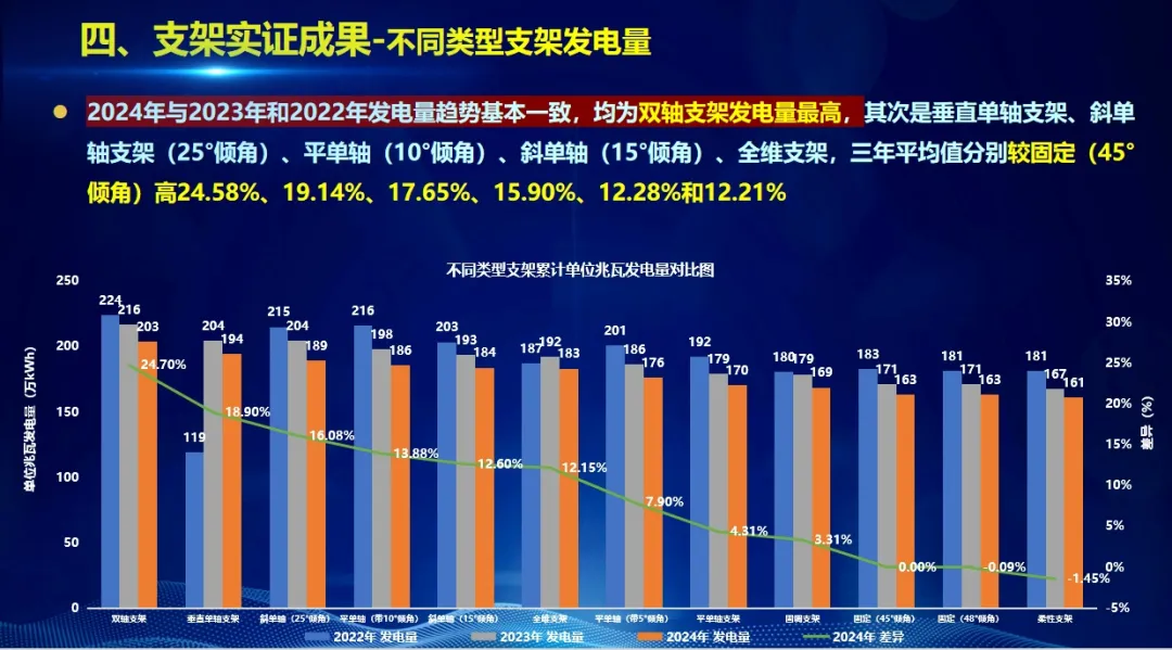 近日,国家光伏、储能实证实验平台(大庆基地)发布2024年度数据成果。报告显示,双轴跟踪支架在三年实证周期内发电量最高,且跟踪支架在电价高峰时段发电更优。该报告数据结果与维旺光电核心产品的技术特性高度契合,为维旺光电长期坚持的跟踪支架技术路线提供了强有力的实证支撑。