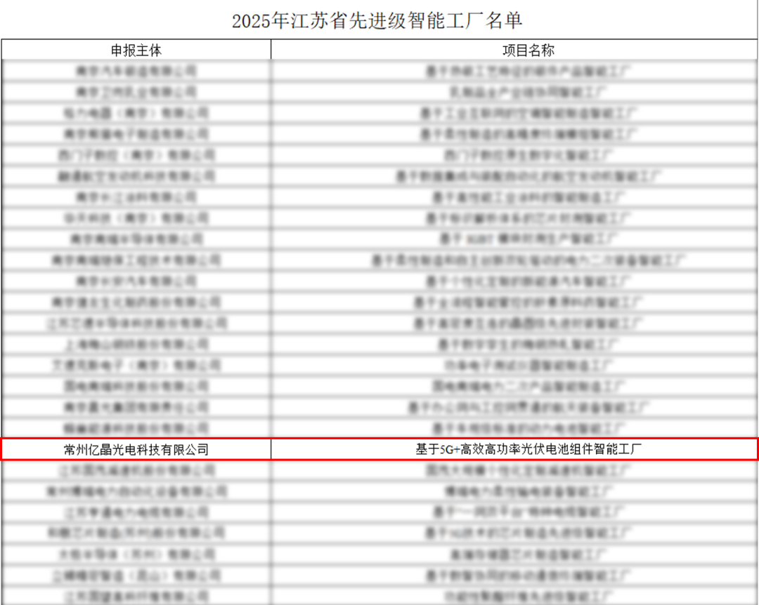 近日,江苏省工业和信息化厅发布了“关于2025年江苏省先进级智能工厂名单的公示”,常州亿晶光电科技有限公司(以下简称“亿晶光电”)凭借“基于5G+高效高功率光伏电池组件智能工厂”项目成功上榜, 这标志着亿晶光电在智改数转网联方面达到了省内先进水平,也为江苏省乃至全国的光伏产业智能化发展树立了新的标杆。