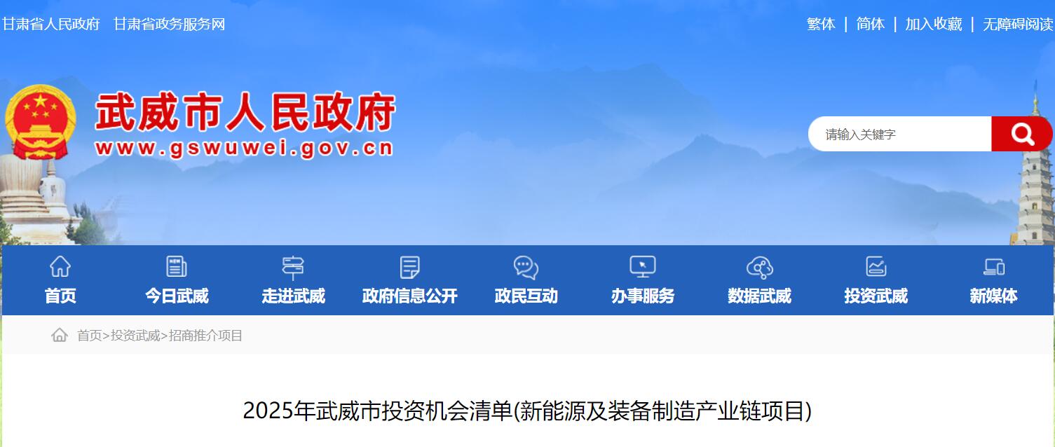 近日,甘肃省武威市人民政府公布了2025年武威市投资机会清单,共拟建设53个光伏、储能等新能源及装备制造产业链项目,总投资为566.77亿元,其中包含12个光伏类项目,涉及投资金额95亿元。