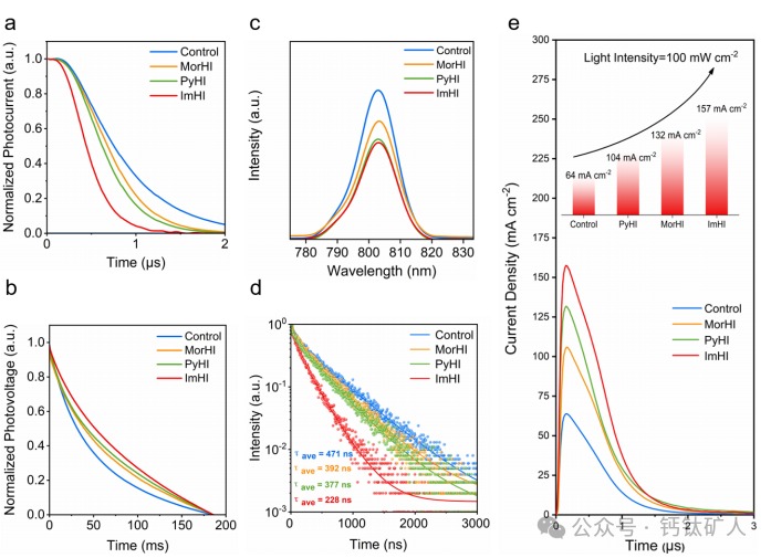 图3. 载流子动力学研究。a) Control-pero、MorHI-pero、PyHI-pero和ImHI-pero器件的TPC特性。b) Control-pero、MorHI-pero、PyHI-pero和ImHI-pero器件的TPV特性。c) Control-pero、MorHI-pero、PyHI-pero和ImHI-pero的PL特性,其结构为玻璃/SAM/钙钛矿。d) Control-pero、MorHI-pero、PyHI-pero和ImHI-pero的TRPL特性,其结构为玻璃/ SAM/钙钛矿。e) 在100 mW cm⁻²光强下,通过CE测量提取的控Control-pero、MorHI-pero、PyHI-pero和ImHI-pero器件的载流子密度。