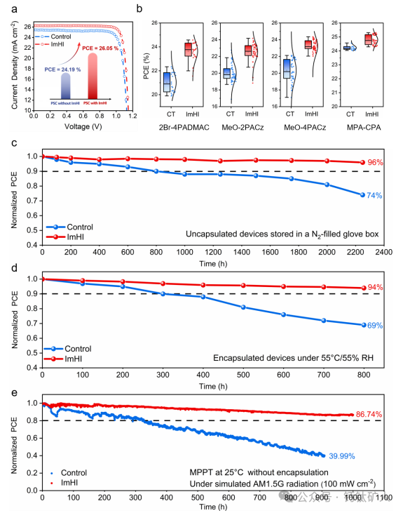 图4. 器件性能。a) 性能最佳的Control-pero器件和ImHI-pero器件的J-V曲线。b) 基于不同SAMs处理的ImHI的器件的统计PCE。c) 未封装的Control-pero器件和ImHI-pero器件在充满氮气的手套箱中黑暗条件下储存的稳定性。d) 在白光LED灯(AM 1.5G光照条件)下,封装的Control-pero器件和ImHI-pero器件的热稳定性(55℃)和湿度稳定性(55%相对湿度)。e) 在充满氮气的手套箱中,白光LED灯(AM 1.5G光照条件)下,未封装的Control-pero器件和ImHI-pero器件的操作稳定性。