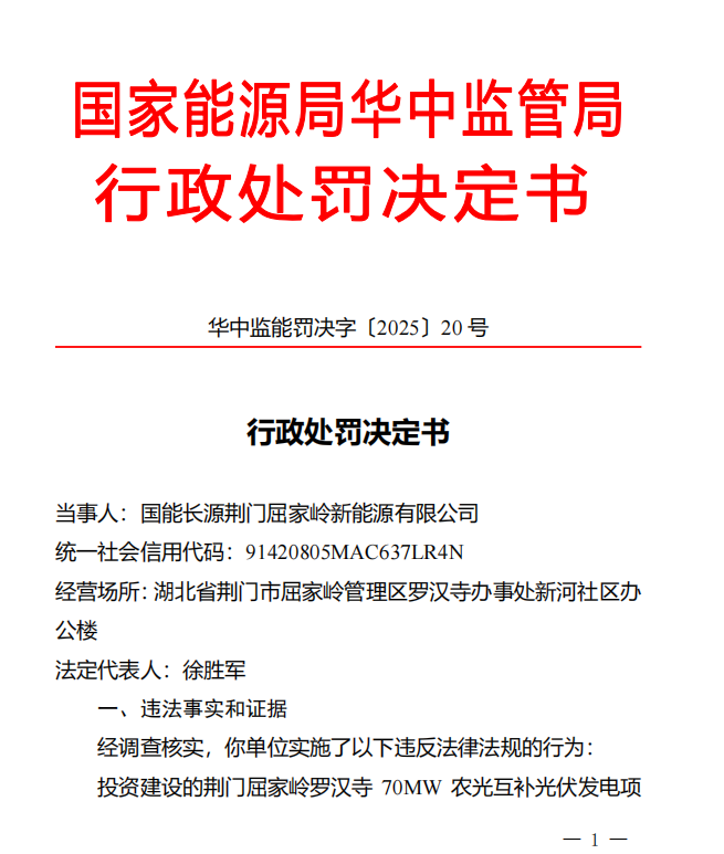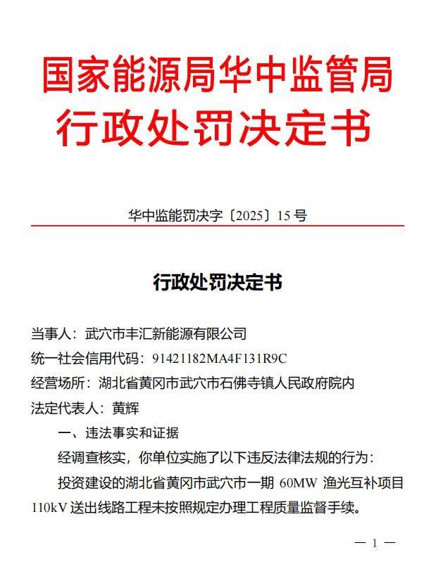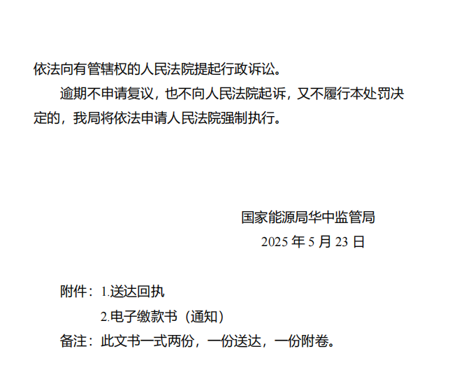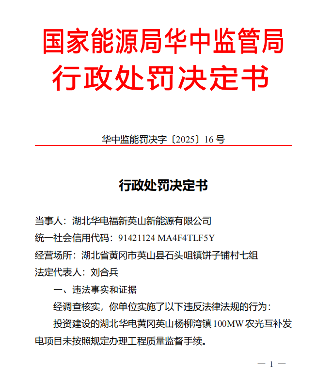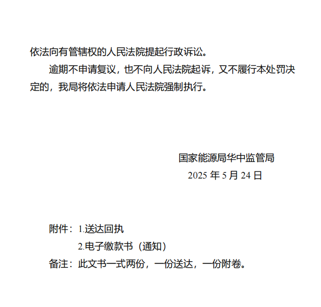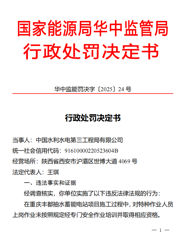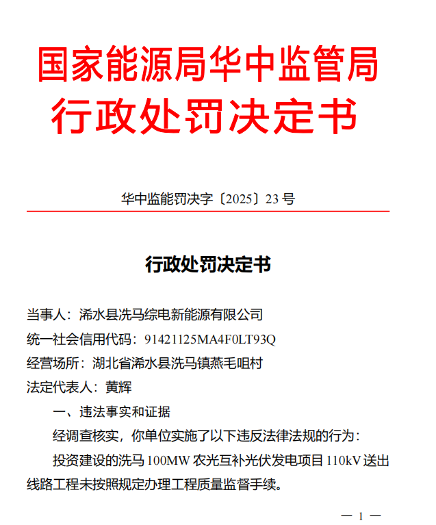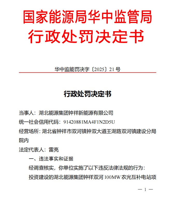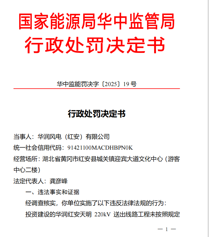 5月21日,国家能源局华中监管局发布行政处罚决定书,涉及三峡旗下企业2家、华电旗下企业2家以及华润、国家能源集团、湖北能源集团、中国电建旗下等共计10家企业,累计处罚金额达262万元。