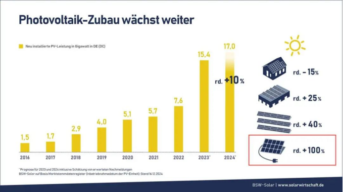 据德国太阳能行业协会BSW-Solar日前发布的数据显示,截至2024年年底,2024年,德国共新增105万个光伏系统,其中43.5万个为阳台光伏。