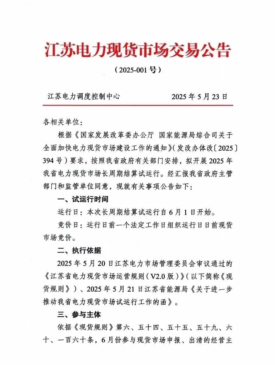 近日,江苏省电力调度中心发布了江苏电力现货市场交易公告。
