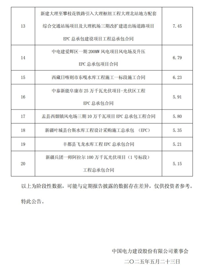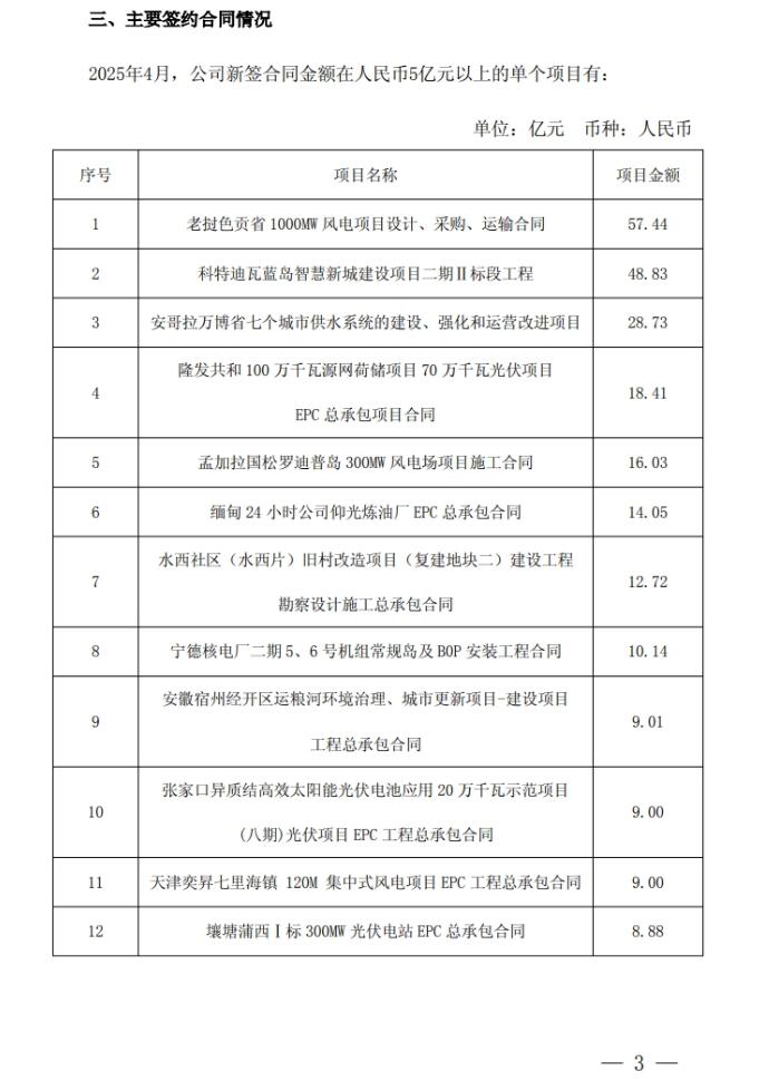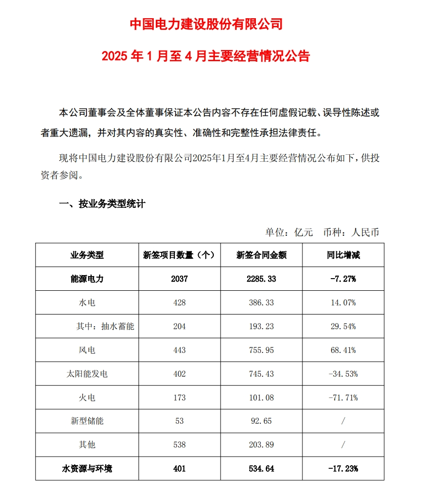 5月23日,中国电建发布2025年1月至4月主要经营情况公告。据公告显示,中国电建1-4月新签太阳能发电项目402个,合同金额745.43亿元,同比下降34.53%。