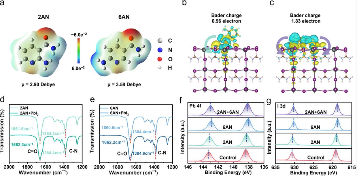 分子与钙钛矿相互作用的理论与实验验证。a) 2AN与6AN的分子结构及静电势分布;b) 2AN(垂直取向)和c) 6AN(平行取向)在钙钛矿表面的电荷密度差计算结果(蓝色:电子耗尽区;黄色:电子富集区);d) 2AN及2AN+PbI2与e) 6AN及6AN+PbI2在1200-2000 cm-1波数范围内的傅里叶变换红外光谱;f) 对照组与经2AN、6AN及2AN+6AN处理的钙钛矿薄膜的Pb 4f和g) I 3d X射线光电子能谱。