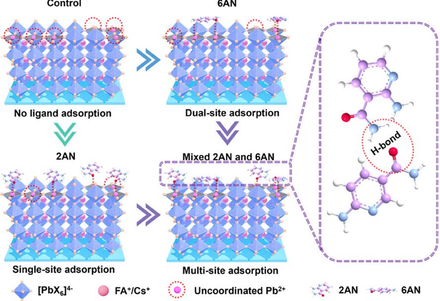 本研究提出了一种有效的界面调控策略,旨在实现电子特性的空间均质化。通过使用两种异构的D-π-A分子——2-氨基烟酰胺和6-氨基烟酰胺,调控烟酰胺分子的空间构象以获得不同吸附取向。借助分子间协同作用,实现柔性多位点吸附,强化了与钙钛矿的相互作用,促进表面电荷的均匀再分布,从而降低空间电子异质性,优化能级排列,并抑制钙钛矿表面的非辐射复合。