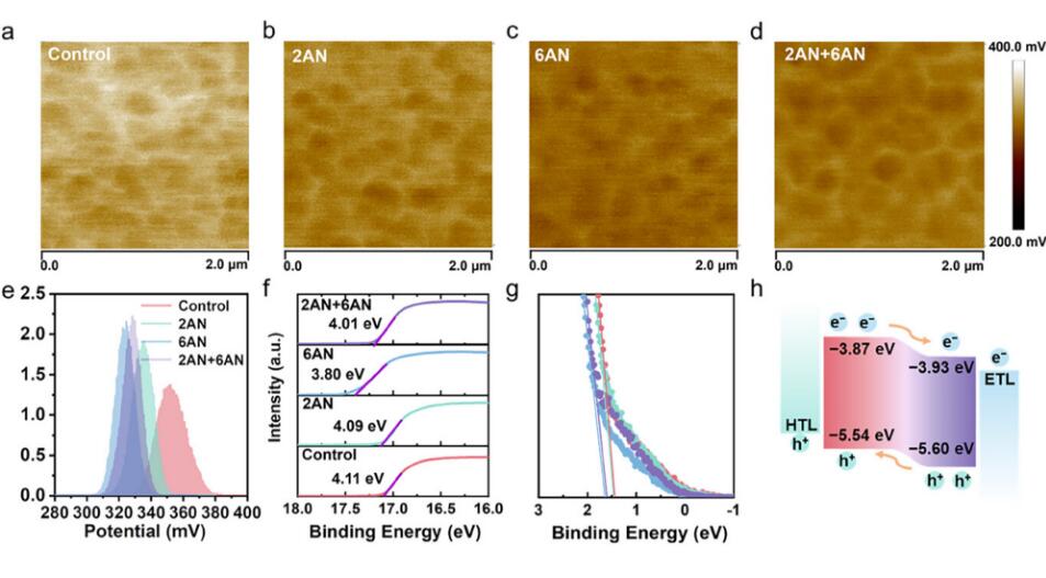 钙钛矿薄膜特性表征。开尔文探针力显微镜(KPFM)表面电势图像:(a) 对照组,(b) 2AN处理,(c) 6AN处理,(d) 2AN+6AN复合处理薄膜;(e) 薄膜表面电势统计分布;(f,g) 对照组及经2AN、6AN和2AN+6AN处理薄膜的紫外光电子能谱(UPS);(h) 经2AN+6AN处理的钙钛矿太阳能电池能级排列示意图。
