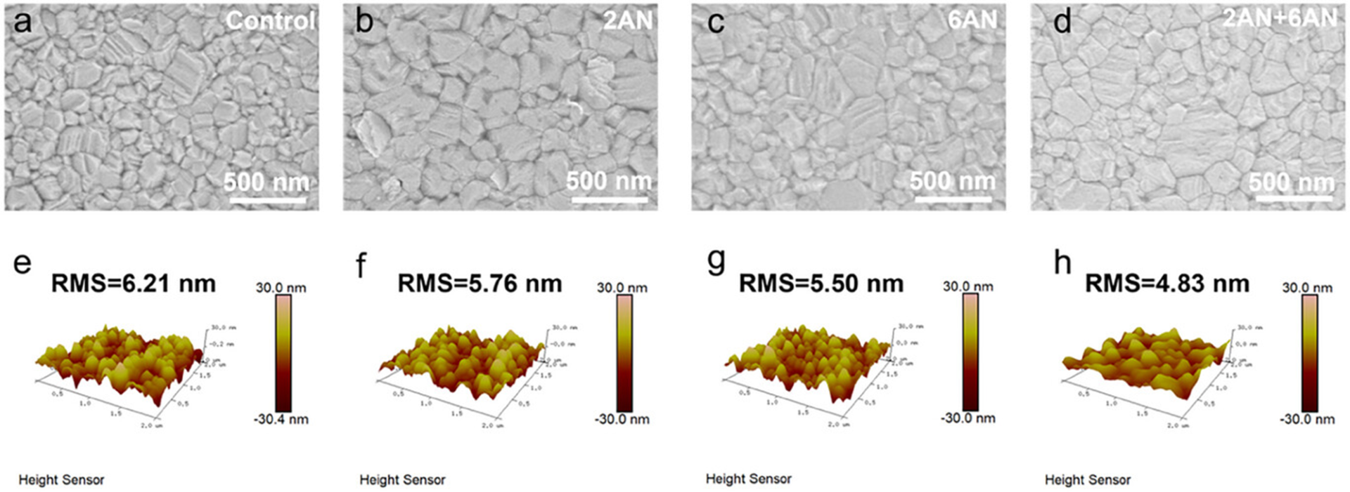 钙钛矿薄膜形貌表征。俯视扫描电镜图像:(a) 未处理对照组,(b) 2AN处理,(c) 6AN处理,(d) 2AN+6AN复合处理薄膜;原子力显微镜图像:(e) 对照组,(f) 2AN处理,(g) 6AN处理,(h) 2AN+6AN处理薄膜。