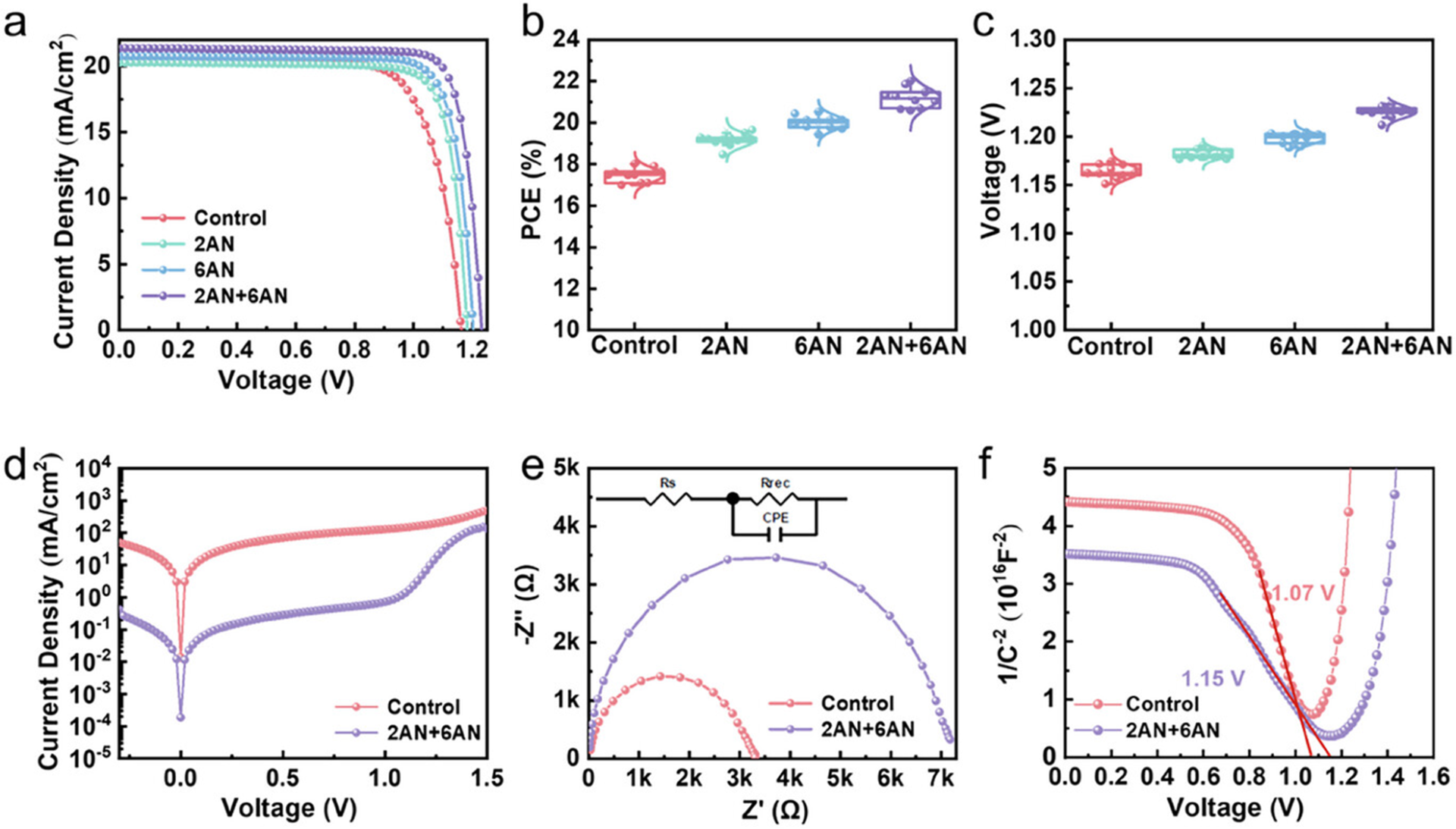 钙钛矿太阳能电池(PSCs)处理前后的光伏特性对比。a) 对照组、2AN处理组、6AN处理组及2AN+6AN复合处理组PSCs的电流密度-电压(J-V)特性曲线;b) 光电转换效率(PCE)及c) 开路电压(VOC)的统计分布结果;d) 对照组与2AN+6AN处理组PSCs的暗态J-V曲线;e) 对照组与2AN+6AN处理组PSCs的奈奎斯特曲线;f) 对照组与2AN+6AN处理组PSCs的莫特-肖特基曲线。