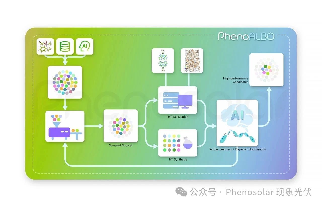 在这场钙钛矿光伏技术革命的核心战场,新材料开发正成为决胜关键。其中,自组装单分子层(SAMs)作为关键界面修饰材料,直接决定着空穴传输层的能级匹配与器件稳定性。传统材料研发面临"大海捞针"困境:科学家需要从比地球沙粒总数还多的分子组合中筛选理想材料,往往耗时数年。这种现象在材料学界被称为"试错困境"。现象光伏研发的智能材料开发系统——PhenoALBO(Active Learning + Bayesian Optimization) ,就像给科学家配备了一台"分子放大镜"——通过机器学习预测、量子化学计算模拟和机器人实验的"铁三角"协作,将材料研发效率提升至全新维度。