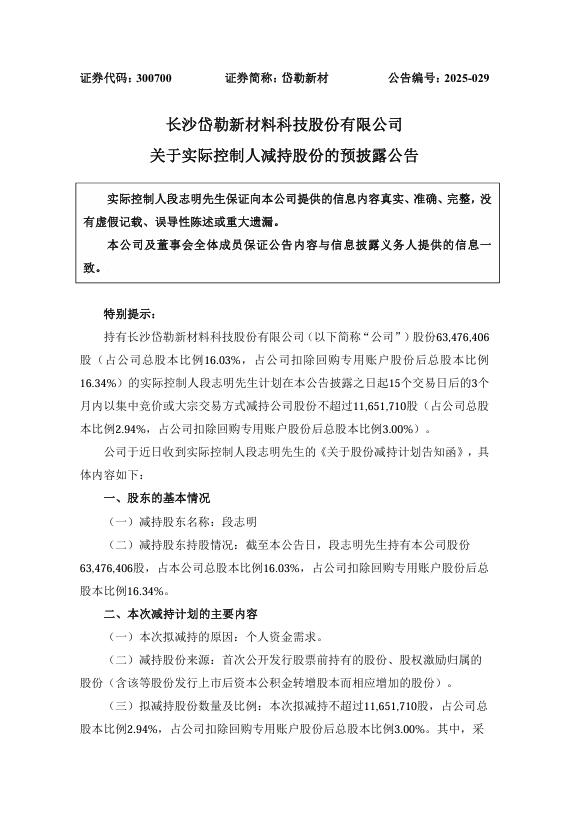 近日,岱勒新材(300700.SZ)发布关于实际控制人减持股份的预披露公告,公告称,公司实际控制人段志明先生计划在本公告披露之日起15个交易日后的3个月内,以集中竞价或大宗交易方式减持公司股份不超过11,651,710股,占公司总股本比例2.94%,占公司扣除回购专用账户股份后总股本比例3.00%,拟减持原因为个人资金需求。