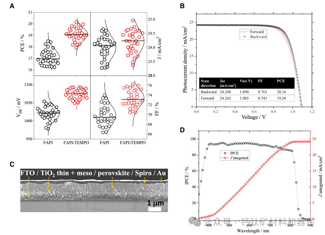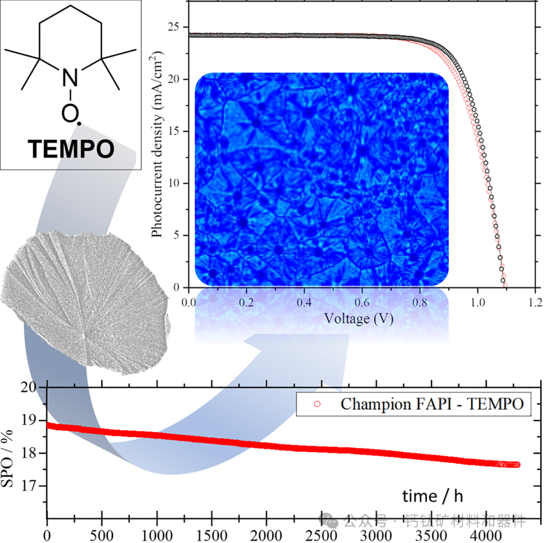 该方法通过使用2,2,6,6-四甲基哌啶氧基(TEMPO)体钝化和快速光子退火生产了高性能、稳定的甲脒碘化铅(FAPI3)钙钛矿太阳能电池(PSCs)。该团队使用快速红外退火(FIRA) 制造了功率转换效率(PCE)超过20%的TEMPO-FAPI3 PSCs。