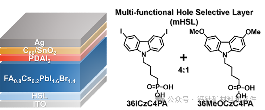 宽带隙钙钛矿电池结构示意图和多功能空穴选择层分子结构