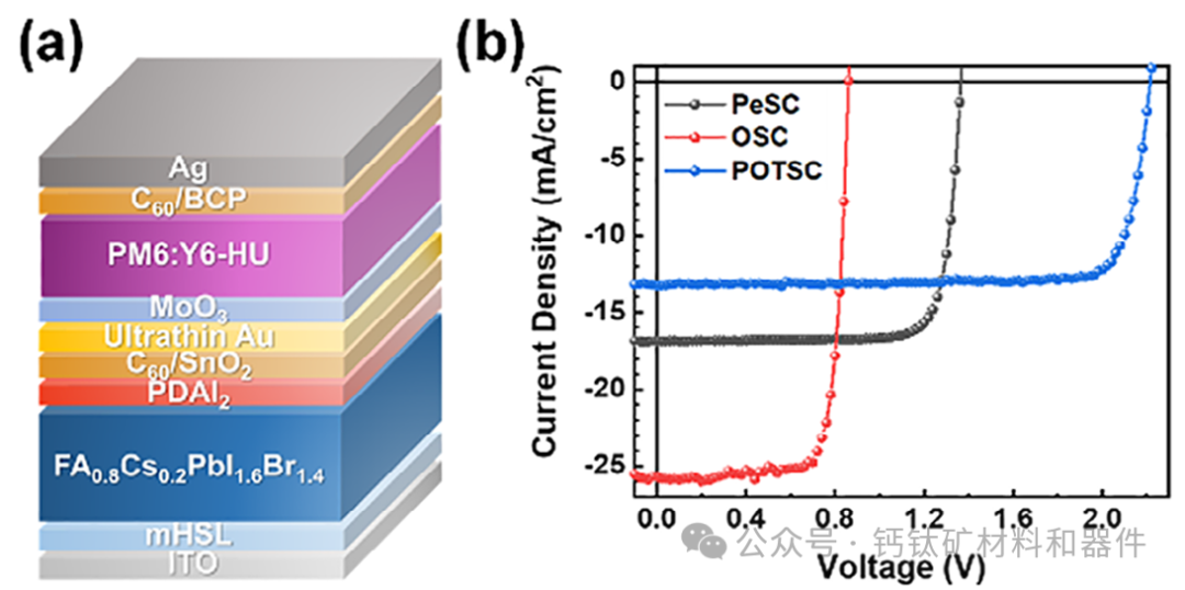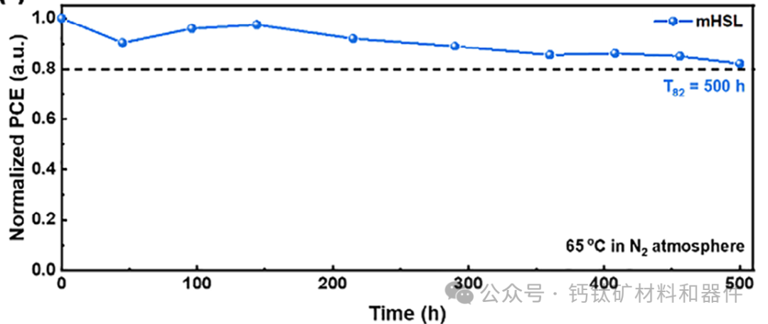 这一效率水平是全球钙钛矿-有机叠层太阳能电池有史以来最高的效率水平之一。此外,该器件在长时间暴露在65°C的高温和连续光照500小时,仍能保持其80%以上的初始效率,表现出优异的长期稳定性。