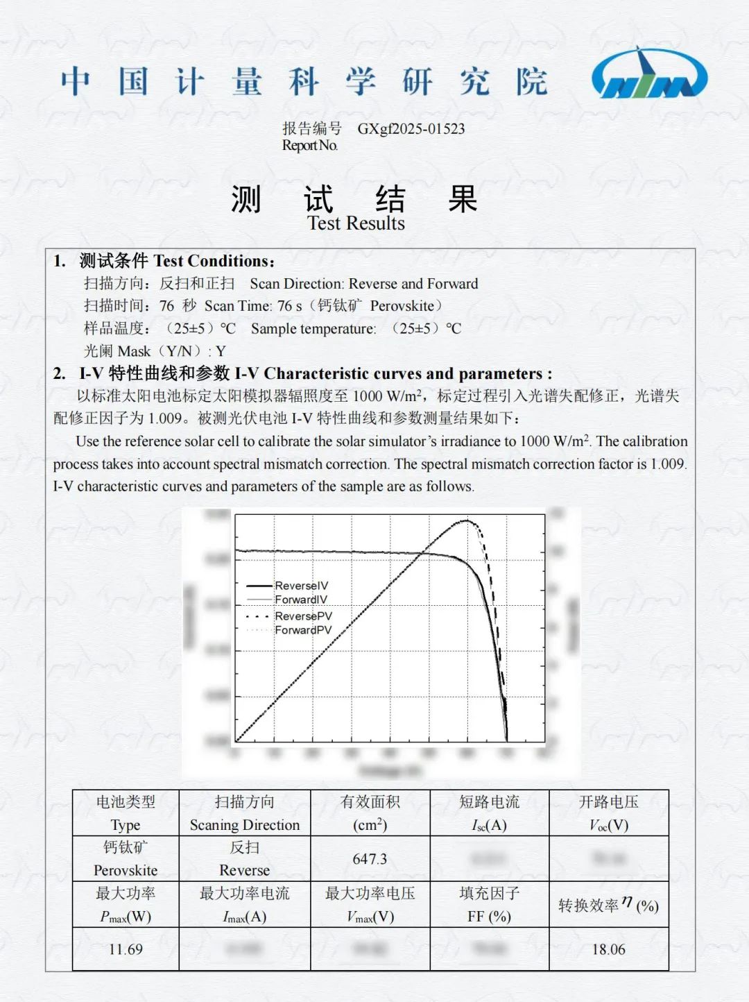 近日,江阴晶皓新能源科技有限公司取得重大进展。经中国计量科学研究院认证,其研发的30cm*30cm大尺寸超薄柔性钙钛矿太阳能电池光电转化效率达 18.06%,刷新领域纪录。