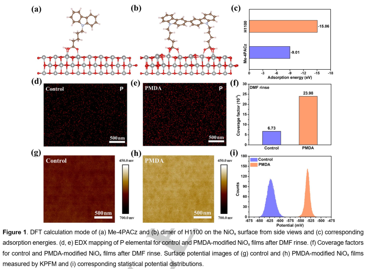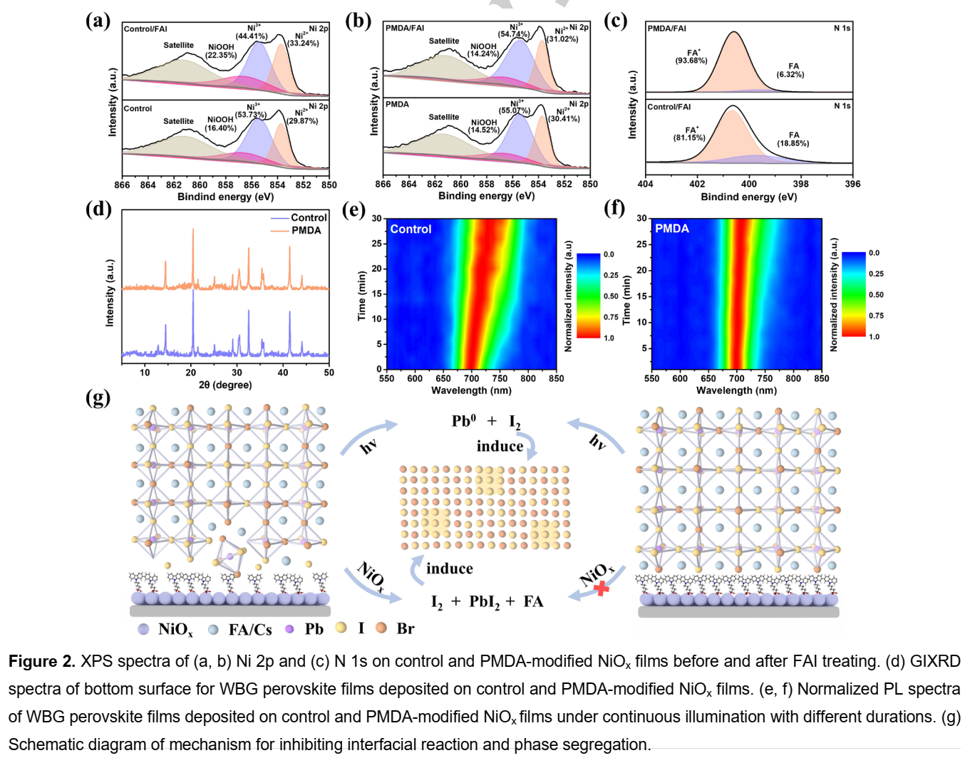 在此,华南理工大学严克友教授团队和香港科技大学颜河教授团队通过引入聚(咔唑膦酸)的聚合物多齿锚定(PMDA)策略来设计底部界面并抑制相分离。多个重复膦酸基团在NiOx上形成的增强且均匀的锚定作用显著优化了底部界面,抑制了不利的界面反应,从而减轻了宽带隙钙钛矿的相分离。