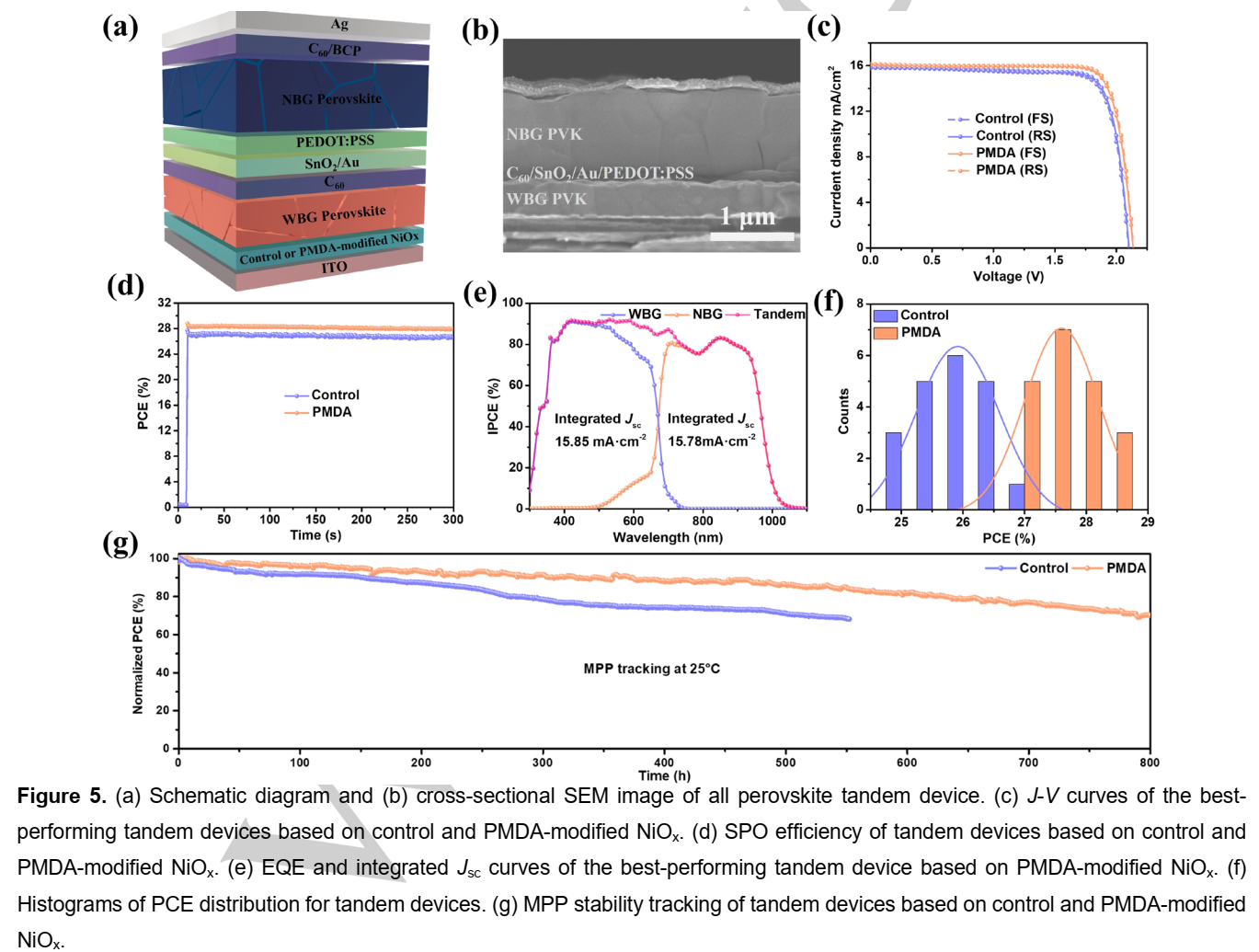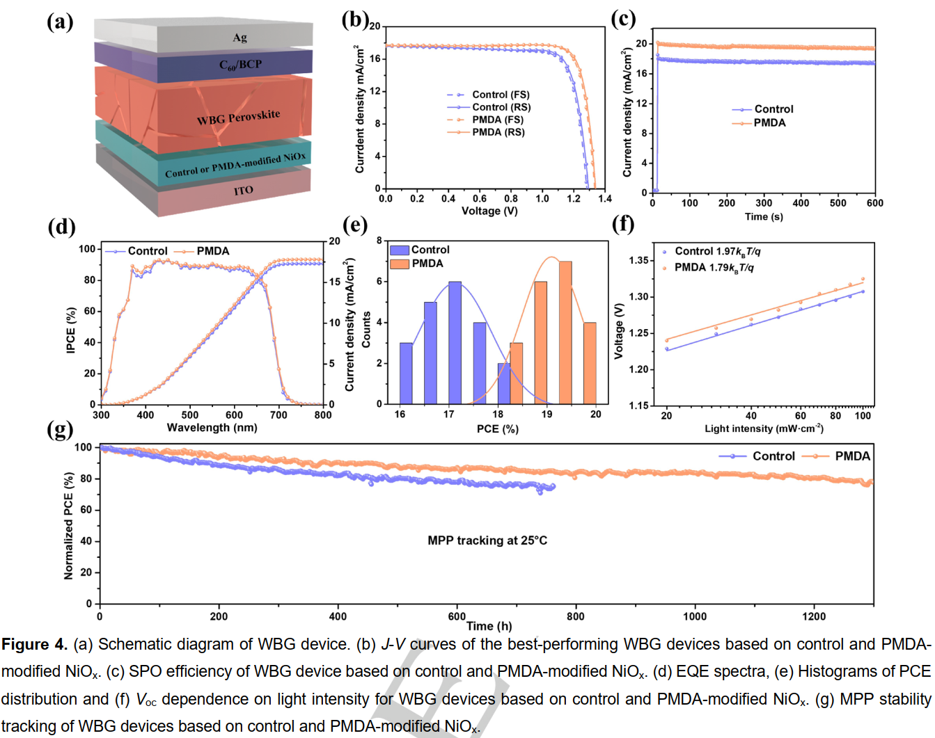 结果表明,PMDA修饰的宽带隙钙钛矿太阳能电池(WBG PSCs)的功率转换效率(PCE)高于对照器件(19.84% vs 18.18%),同时具有更好的器件光稳定性(T80=1200小时 vs 500小时)。与窄带隙(NBG)钙钛矿太阳能电池结合后,PMDA修饰的叠层太阳能电池的功率转换效率高达28.51%,且器件工作光稳定性超过700小时(T80)。