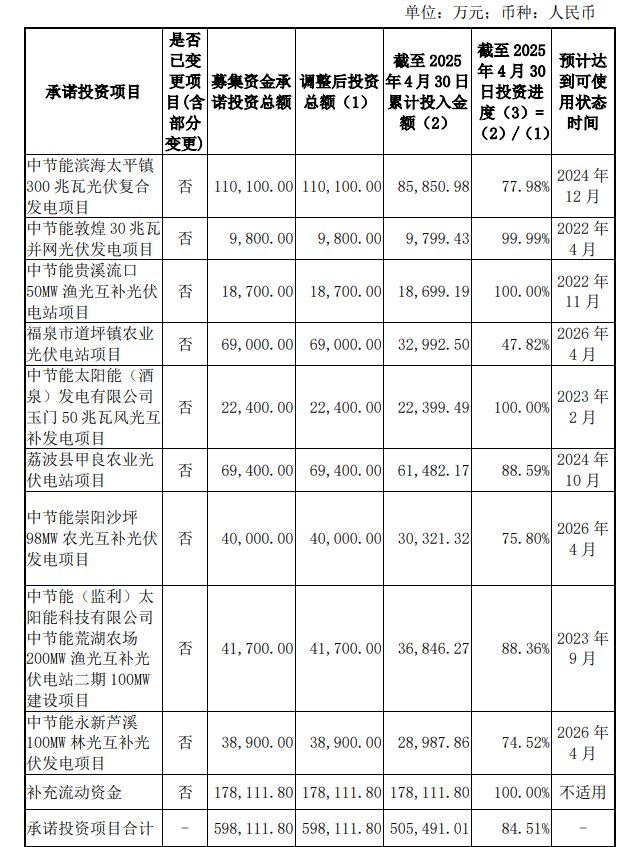 对中节能扬州真武 150MW渔光互补光伏发电项目、中节能关岭县普利长田 100MW农业光伏电站项目、中节能册亨县弼佑秧项100MW农业光伏电站项目、中节能册亨县双江秧绕 100MW农业光伏电站项目预计达到可使用状态日期调整为2026 年 12 月。
