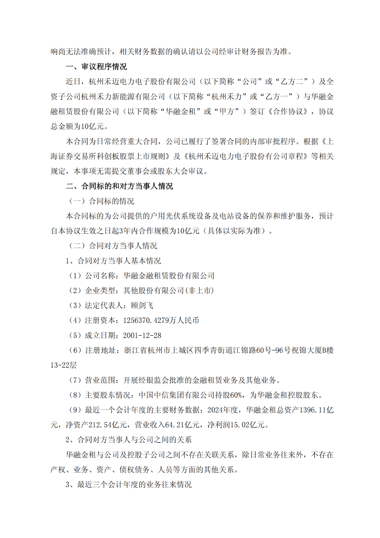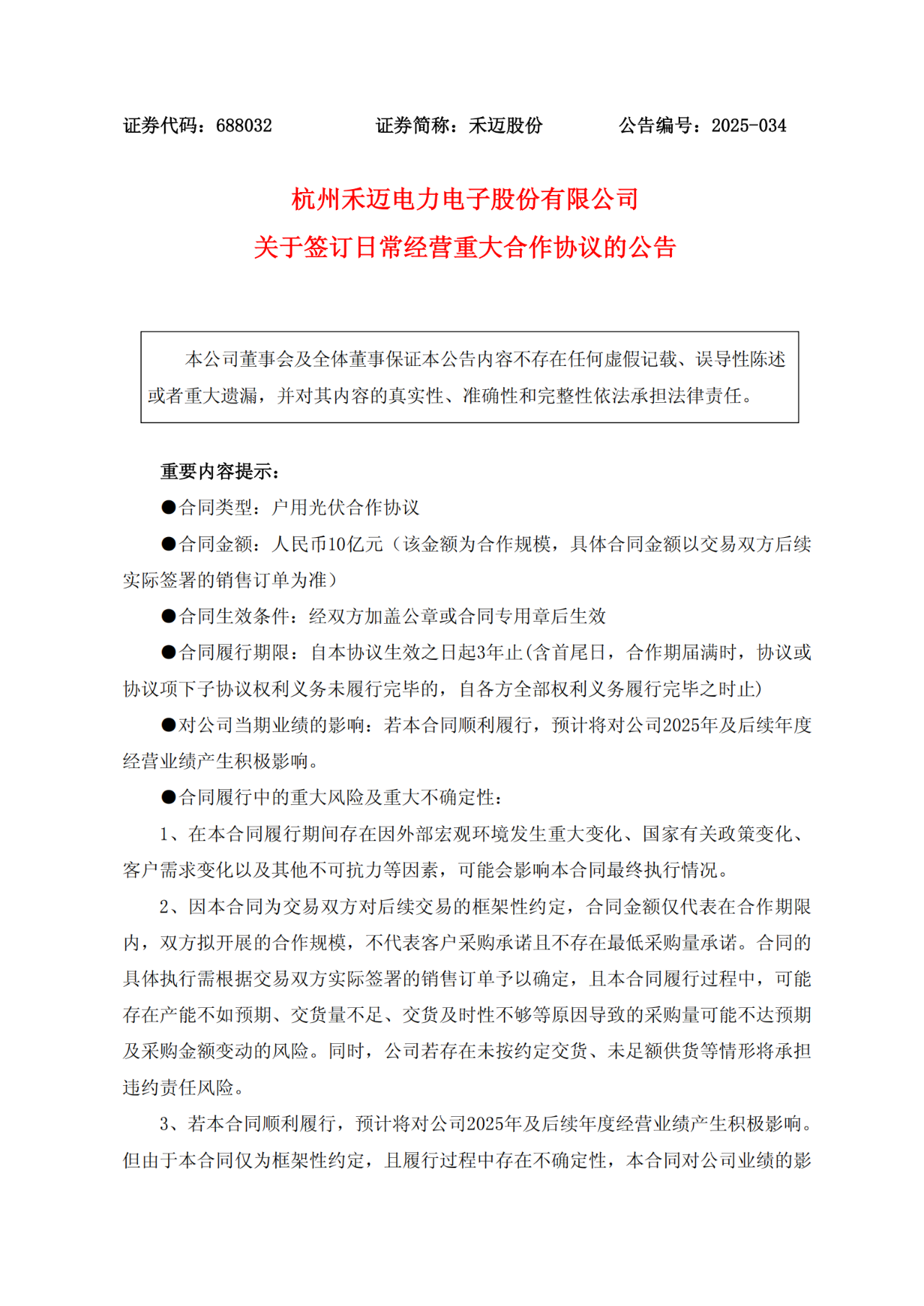 5月27日,禾迈股份发布《关于签订日常经营重大合作协议》的公告,正式宣布与华融金融租赁股份有限公司(以下简称“华融金租”)达成“户用光伏项目开发及运维”合作协议。