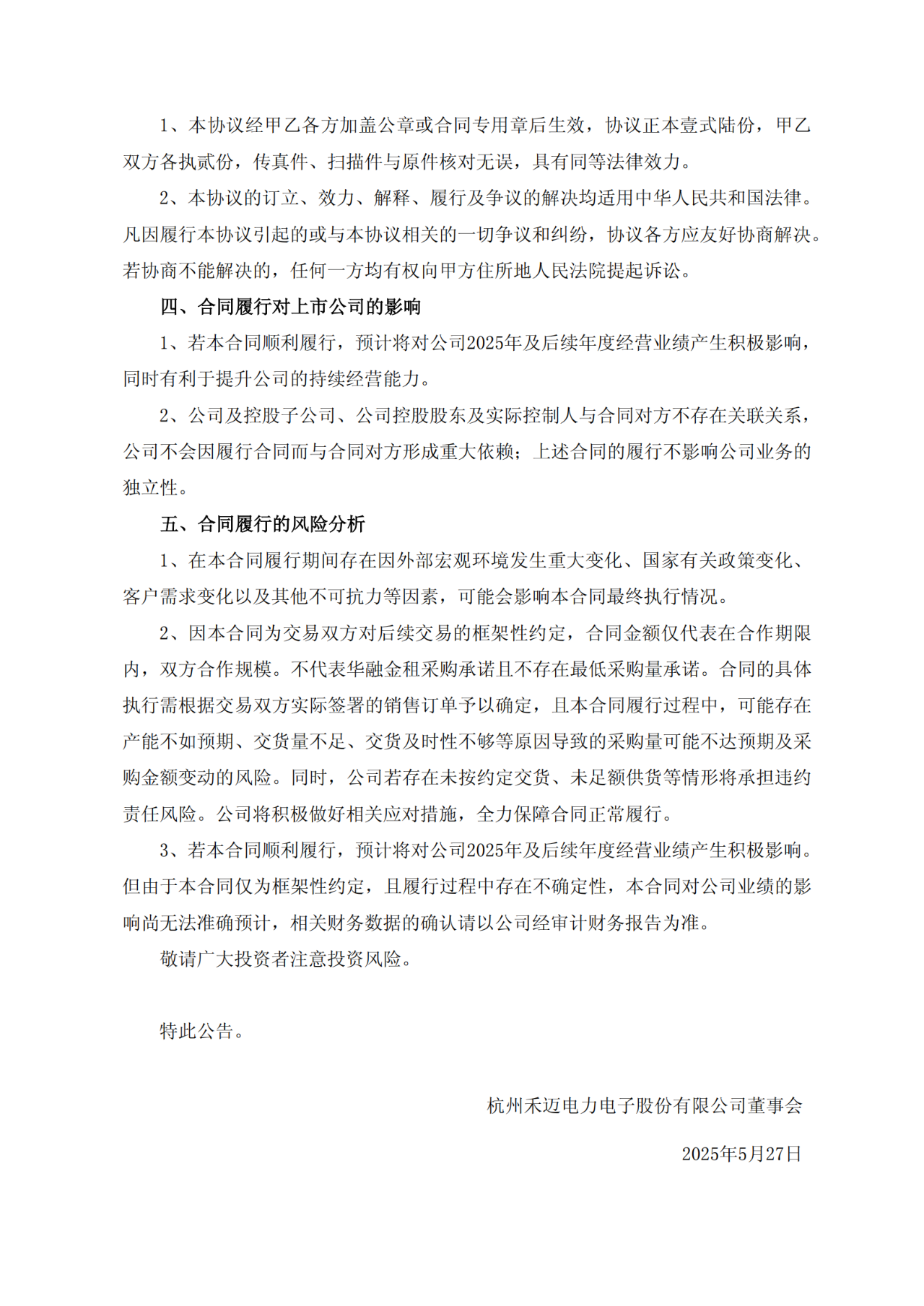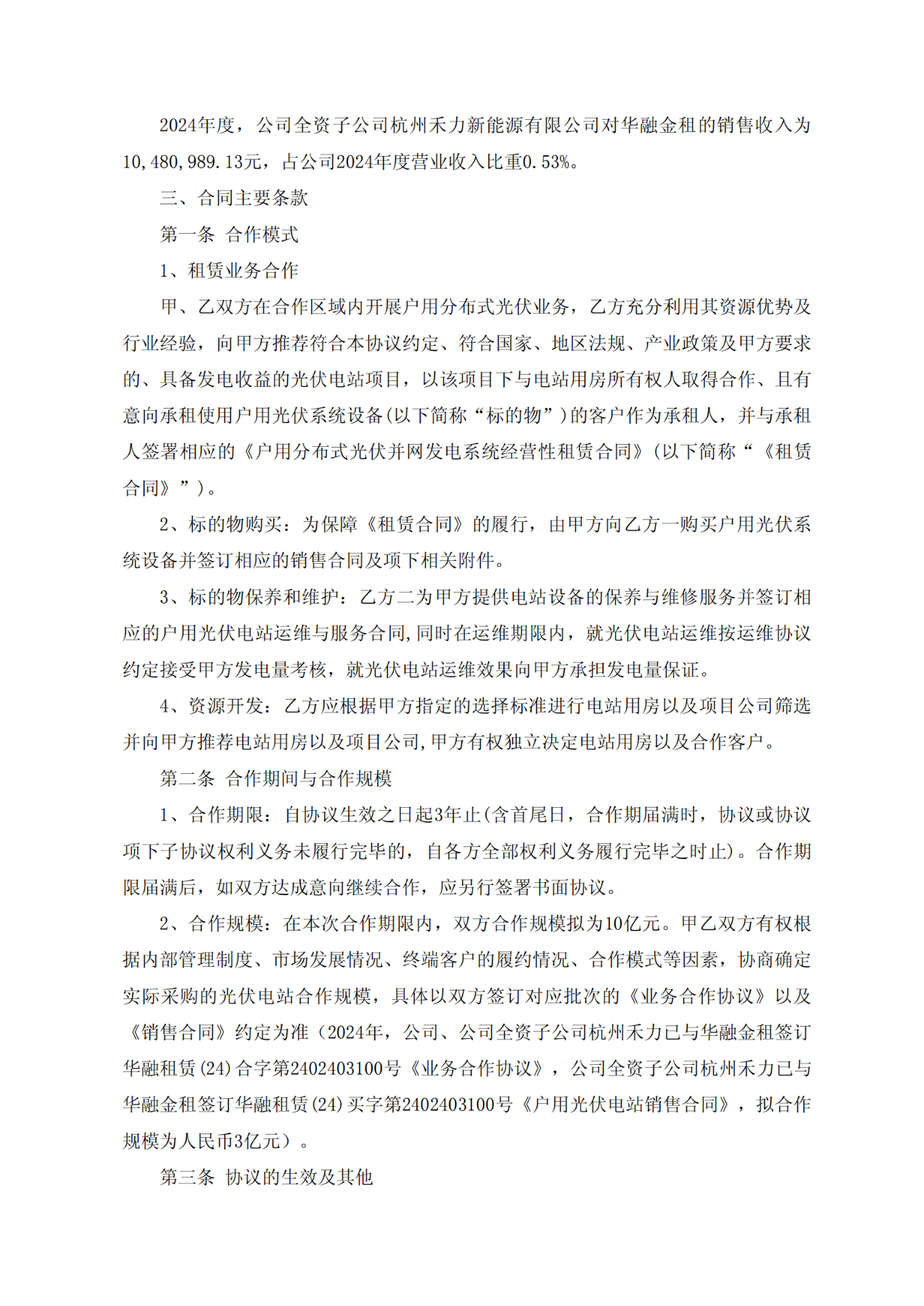 在合作内容方面,禾迈股份向华融金租(甲方)推荐符合要求且具备发电收益的光伏电站项目,并与承租人签署相应的《户用分布式光伏并网发电系统经营性租赁合同》,这有助于华融金租快速获取优质的光伏电站项目资源,加速在户用光伏领域的布局。另一方面,禾迈股份将为华融金租提供电站设备的保养与维修服务,并接受发电量考核,同时就光伏电站运维效果向甲方承担发电量保证。