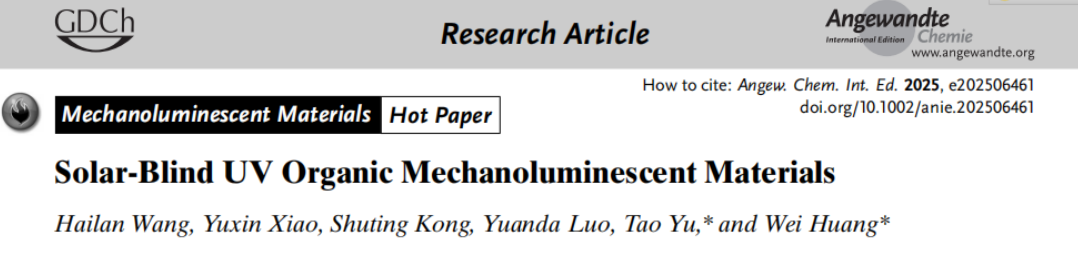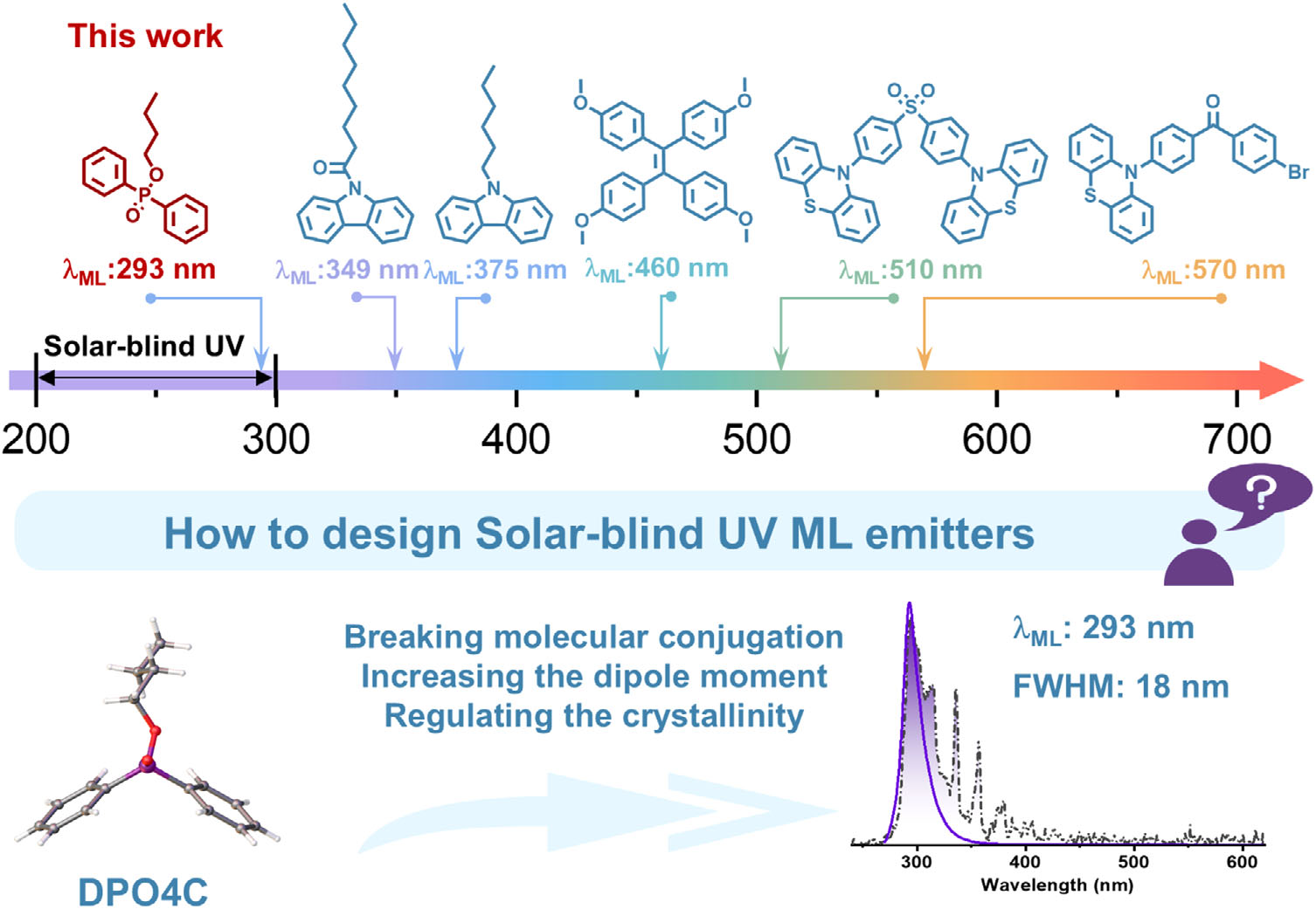 该文章研究了一种新型有机机致发光 (ML) 材料,旨在解决传统 ML 材料在明亮环境中受日光或其他光源干扰的问题。作者通过打破分子共轭并调整堆积模式,设计并合成了系列二苯基膦氧化物衍生物,成功实现了太阳盲紫外 (UV) 区域的 ML 发射,其中 DPO3C 和 DPO4C 在机械刺激下展现出 293 nm 的最强 ML 发射,首次实现了有机太阳盲紫外 ML 材料。此外,作者还通过主客体掺杂策略,实现了从太阳盲紫外 (293 nm) 到近红外 (NIR, 741 nm) 的宽范围可调 ML 发射。这项研究为开发在明亮环境中可检测的 ML 材料,并推动 ML 应用于压力传感、材料损伤监测等领域开辟了新的途径。