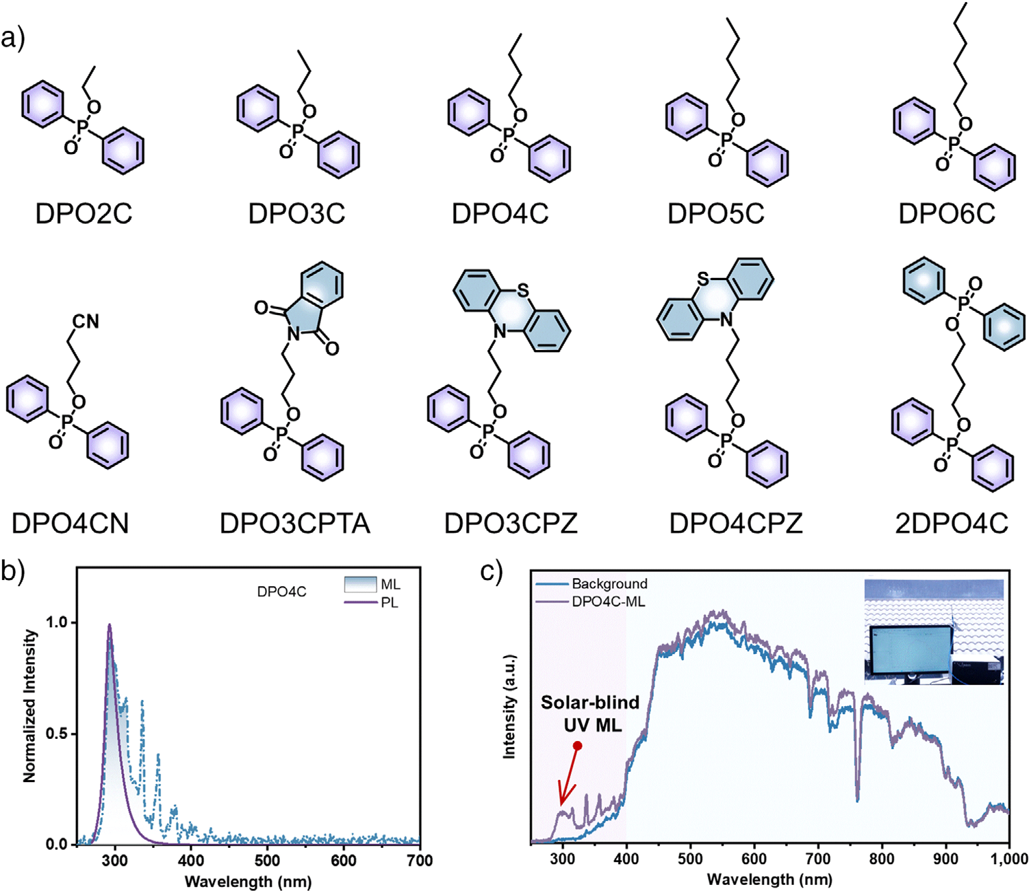 图2. 二苯基磷氧化物衍生物的分子结构和光物理性质。a) 二苯基磷氧化物衍生物的化学结构。b) DPO4C晶体在254 nm激发下的光致发光(PL)和机械发光(ML)光谱。c) 在明亮环境中,DPO4C的ML光谱和太阳光光谱(背景)。插图:明亮环境中的测试装置图。