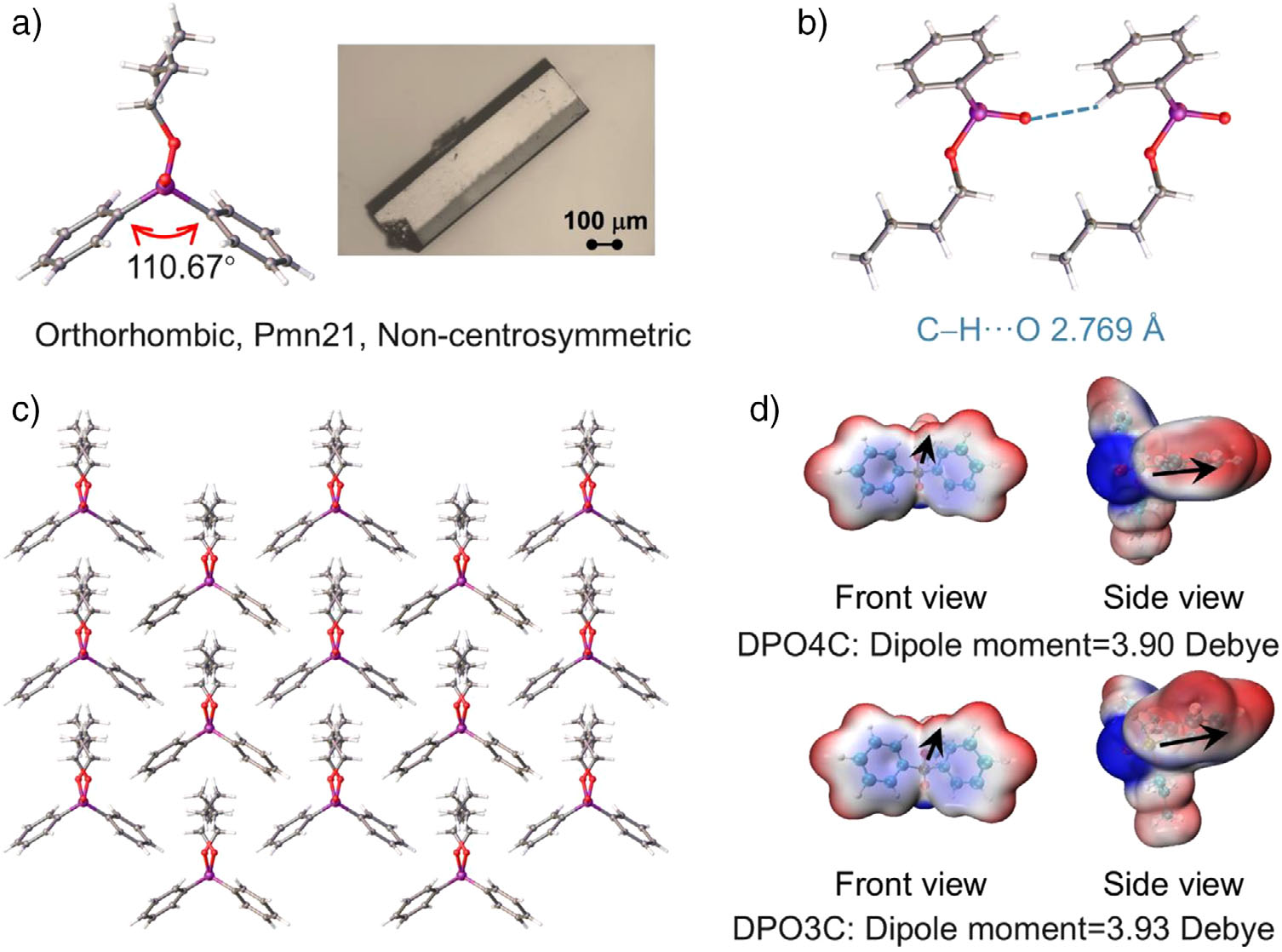 图3. 单晶分析和理论计算。a) DPO4C的单晶结构和晶体照片。b) DPO4C的分子间相互作用。c) DPO4C的分子堆积。d) 计算了DPO3C和DPO4C的构象、静电势分布(蓝色区域代表负功,红色区域代表正功)和偶极矩矢量。
