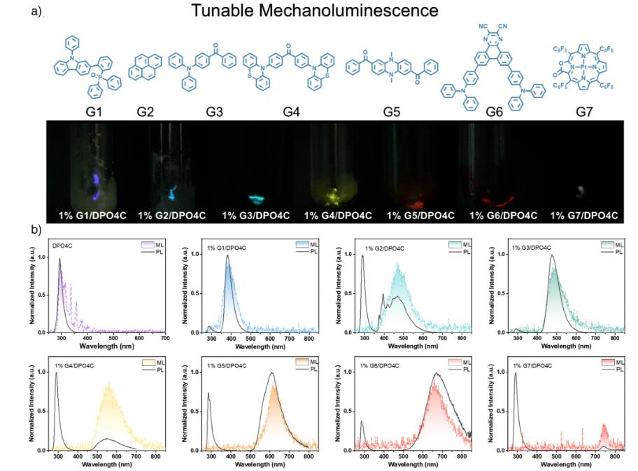 图4. 主客体掺杂体系的照片和光物理性质。a) 客体(G1–G7)的分子结构以及不同主客体掺杂材料的机械发光(ML)照片。b) DPO4C和主客体掺杂材料的光致发光(PL,λex = 254 nm)和机械发光(ML)光谱。