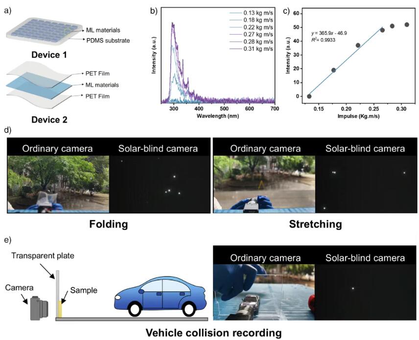图5. 灵敏度器件应用的示范。a) 通过熔融铸造方法制备的灵敏度器件。b) 在不同冲击下DPO4C薄膜的机械发光(ML)光谱。c) 最大ML强度与冲击之间的关系。d) 在折叠和拉伸刺激下DPO4C薄膜的照片。(左:普通相机拍摄;右:太阳盲相机拍摄。)e) 车辆碰撞记录过程的示意图和碰撞过程中的照片。(左:普通相机拍摄;右:太阳盲相机拍摄。)