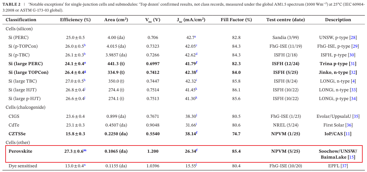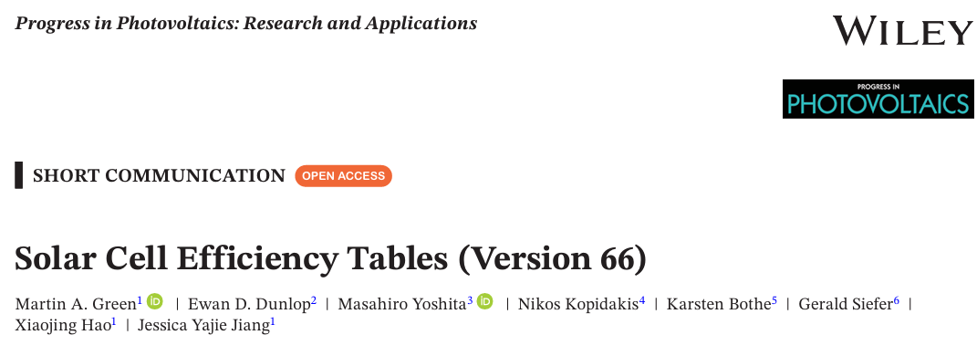 2025年5月26日澳大利亚新南威尔士大学(UNSW)Martin Green教授领导的国际研究小组在光伏领域发布了“太阳能电池效率表”的第 66 版(Solar Cell Efficiency Tables, Version 66)。苏州大学/新南威尔士大学/白马湖实验室钙钛矿太阳能电池最高认证效率达到27.3%(0.1065 cm^2)
