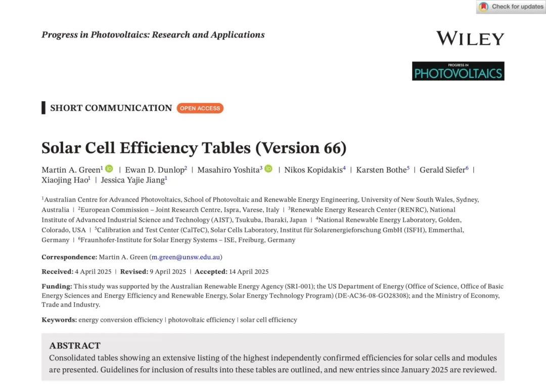 《太阳能电池效率表》是全球光伏行业最权威的电池效率排名表之一,由澳大利亚新南威尔士大学(UNSW)马丁·格林(Martin Green)教授与来自美、日、意、澳等多国顶尖科学家联合编撰,自1993年持续发布于国际权威杂志《Progress in Photovoltaics》,为光伏行业提供权威的最新技术进展,被誉为太阳能电池效率评价的“黄金标准”。