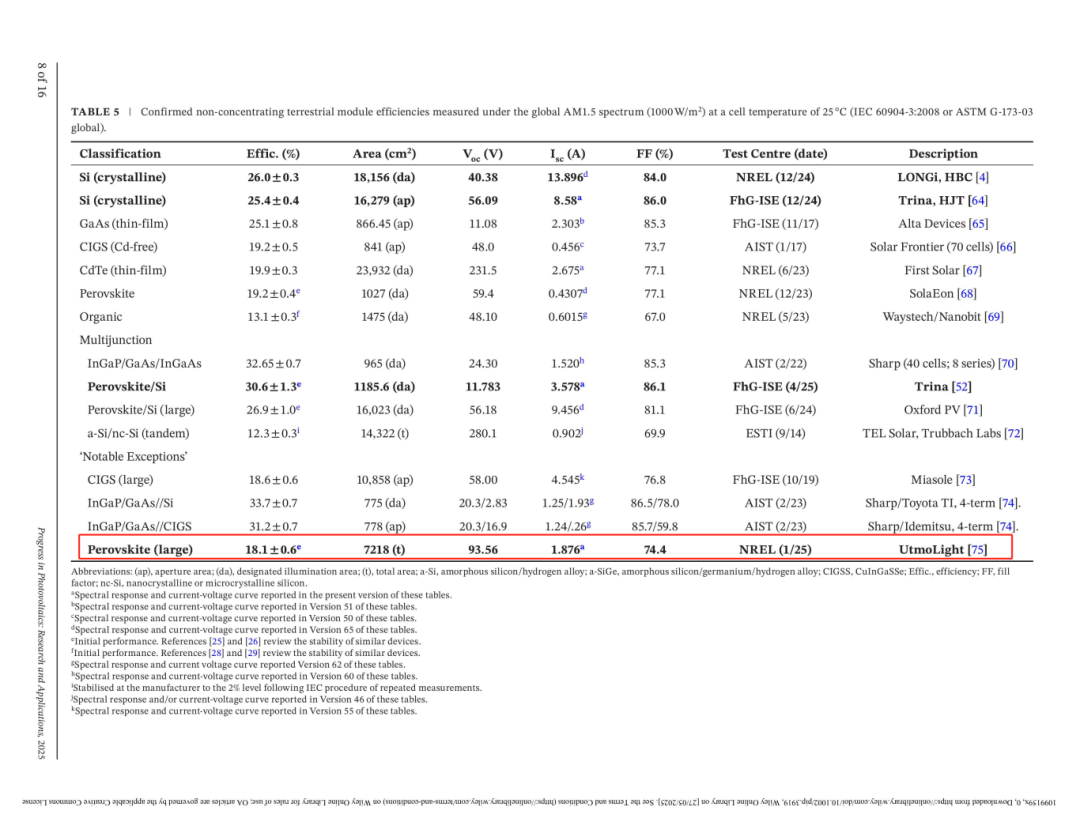 此次荣登榜单,是继获得美国国家可再生能源实验室(NREL)认证后,极电光能0.72㎡钙钛矿标准组件效率再度荣获国际权威机构认可,不仅是公司多年在钙钛矿技术领域创新积累的体现,更充分证明了极电光能在大面积钙钛矿组件制备技术领域的领先优势。