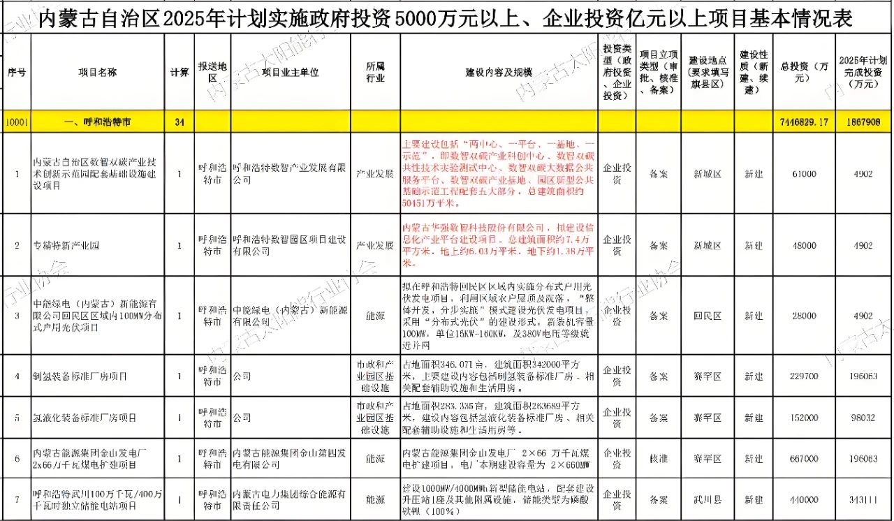 经初步筛选,呼和浩特市2025年计划实施政府投资5000万元以上、企业投资亿元以上能源类项目共34个,总投资约7446829.17万元。