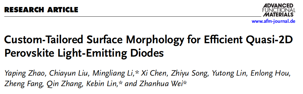 该文章研究了如何通过控制界面来提升准二维钙钛矿发光二极管 (Pero-LEDs) 的性能。准二维钙钛矿具有高激子结合能和优异的光致发光量子产率,但在Pero-LEDs中却存在载流子注入不平衡和非辐射复合等问题。文章提出了一种精确的逐步抗溶剂处理技术,通过调节抗溶剂的添加量,实现了准二维钙钛矿薄膜的定制化表面形貌,形成了可控的丘状形貌。这种形貌不仅增加了发光层和电子传输层之间的接触面积,提高了电子注入效率,还改善了结晶质量并减少了缺陷密度。最终,优化后的器件实现了高达 26.25% 的最大外量子效率 (EQE),亮度也提高了三倍。该研究为形态控制提供了一种简单且可扩展的方法,为高性能钙钛矿光电器件的发展铺平了道路。