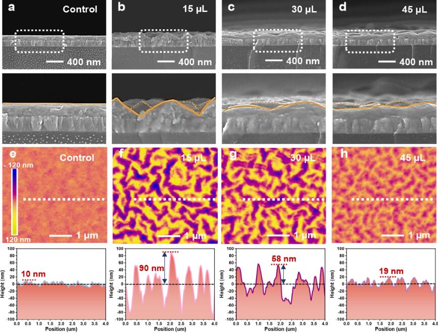 图1. 通过一步法制备的钙钛矿薄膜的横截面扫描电子显微镜(SEM)图像 a),以及使用15 μL b)、30 μL c)和45 μL d)甲苯的逐步法制备的钙钛矿薄膜的横截面SEM图像。相应地,通过一步法制备的钙钛矿薄膜的原子力显微镜(AFM)图像 e),以及使用15 μL f)、30 μL g)和45 μL h)甲苯的逐步法制备的钙钛矿薄膜的AFM图像(下图显示了AFM图像中相应线条扫描的高度,所有AFM图像都使用共享的比例尺表示)。